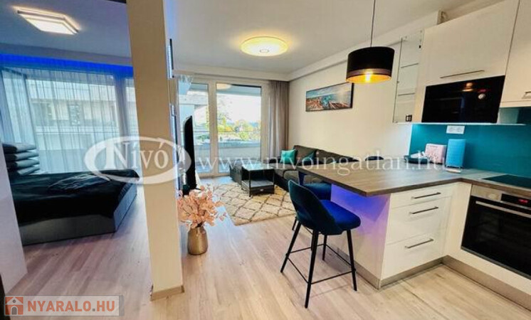 Alsóörsön, partközeli, Balatoni-rálátással, igényes, exkluzív, medencés, 2022-ben épült liftes társasházban, tégla lakás nagy méretű terasszal és teljes, komplett berendezéssel eladó.