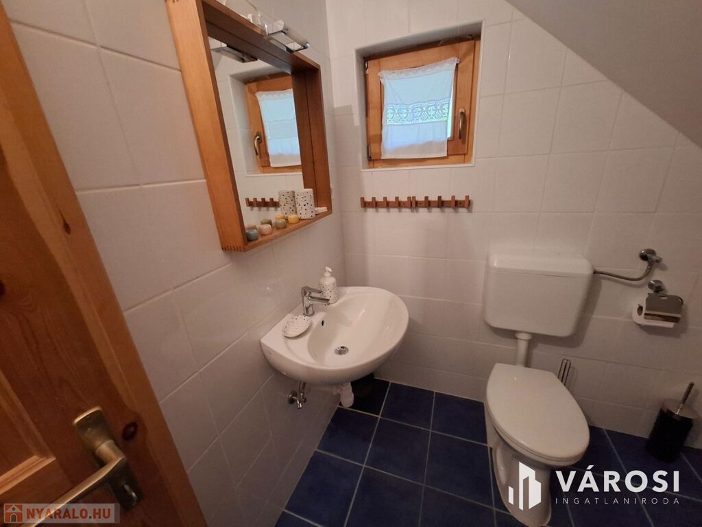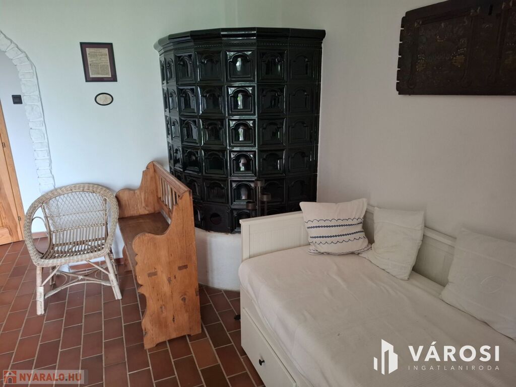 Az alsó részen fedett kocsibeálló, kerti sütő és pihenőterasz található; az épületben amerikai konyhás nappali, fürdőszoba és két félszoba van, cserépkályhával fűtve.