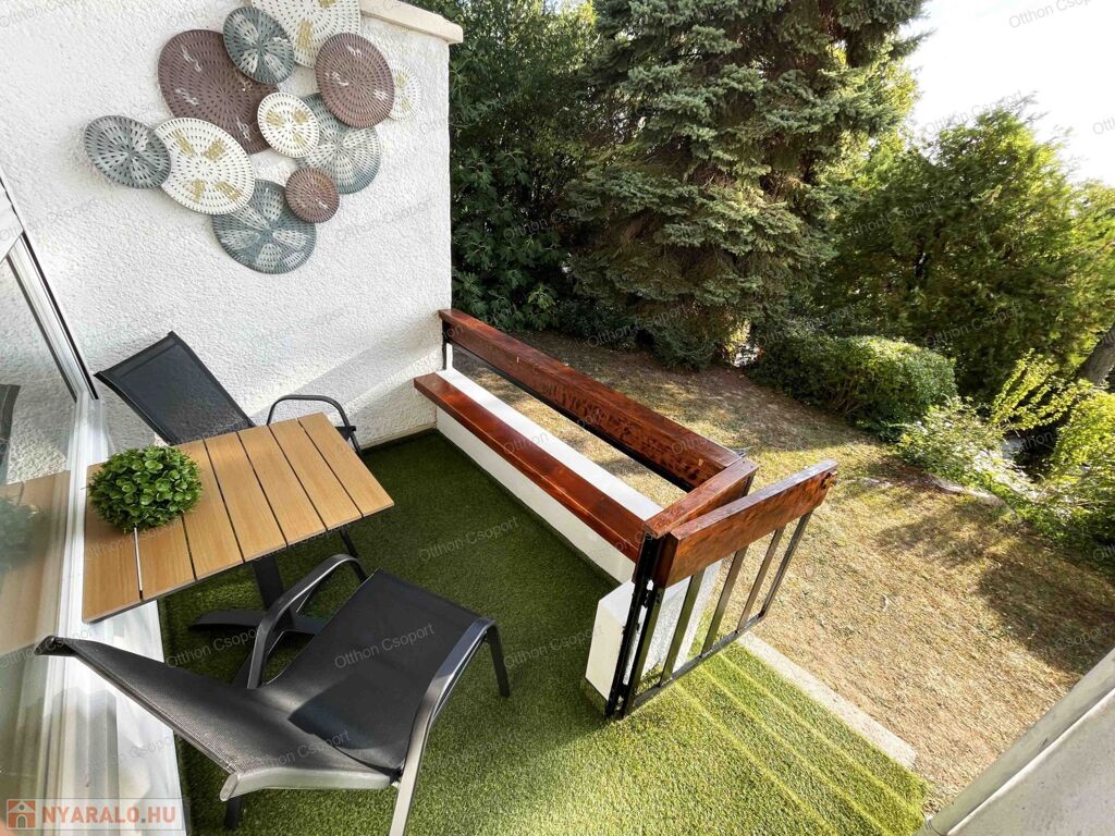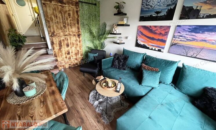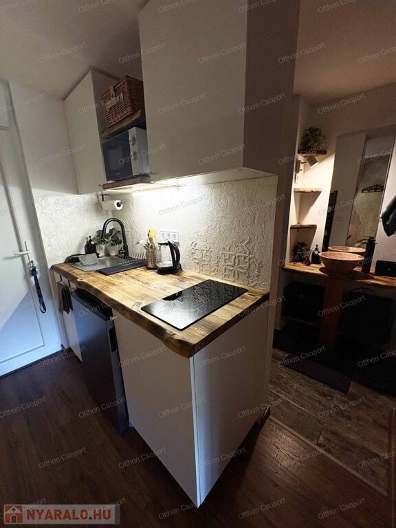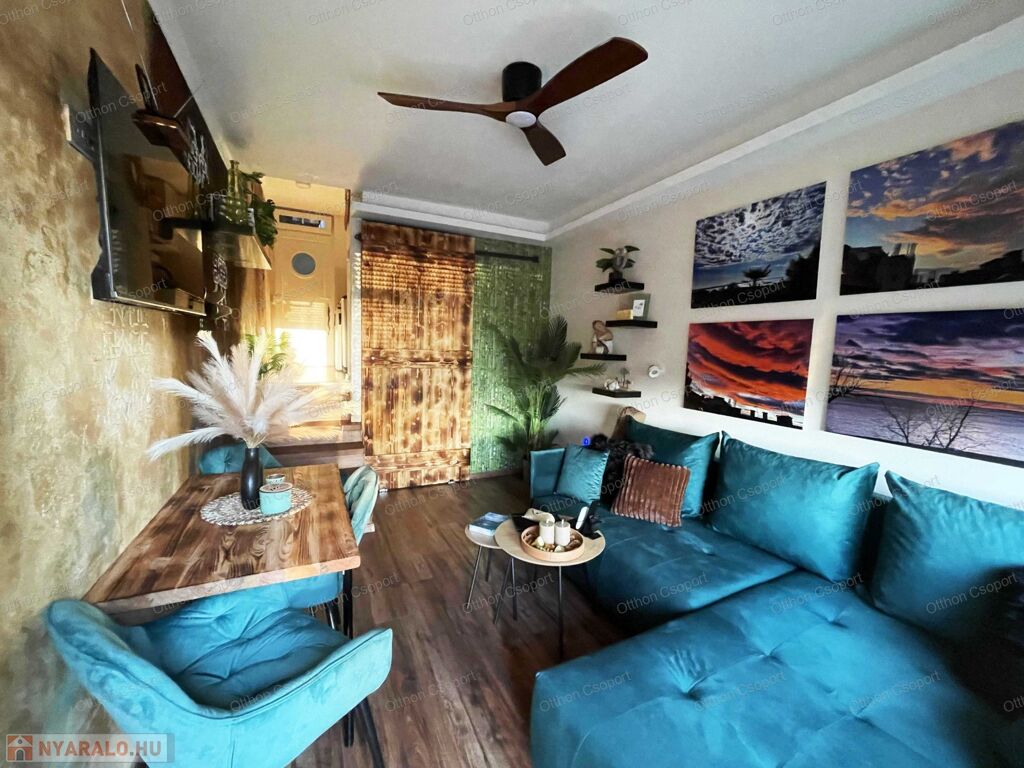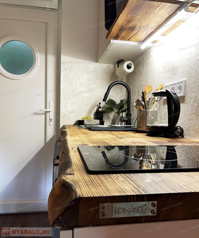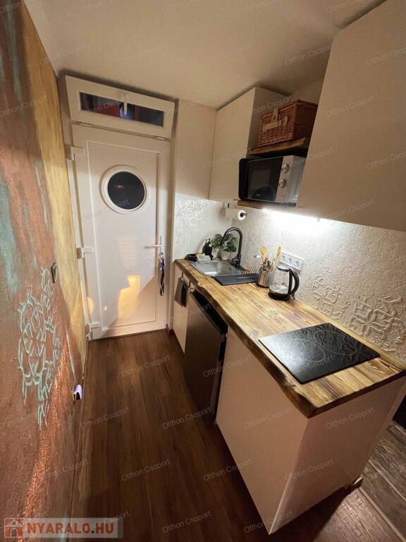 Egyedi tervezésű, prémium design-apartman eladó Balatonalmádi Káptalanfüred részén társasüdülőben, a teraszról balatoni panorámával, gondozott, közös használatú kerttel, napozóval, grillezővel, kiülővel, közúton 600 méterre a hangulatos, családias Káptalanfüred strandtól, gyalog se több néhány percnél. Saját, zárható, árnyékolt kocsibeállóval, parkolóval közvetlenül a ház mellett (amely részét képezi az adásvételnek). Műszakilag tökéletesen felújított és tervező által megdizájnolt állapotban, tehát teljesen új elektromos és vízhálózattal, teljes felületén elektromos fűtőszálas padlófűtéssel, szobatermosztáttal. Dél-keleti tájolású, szépen árnyékolt, földszinti nyaraló, a teraszról kijárással a gyönyörű kertre, melyet kertész gondoz. Alapterülete 25,3 m2, egy nappali/háló kihúzható kanapéval, + egy vendég-fotelágy, 3 személy részére kényelmes alvási lehetőséggel, ill. 3 személyre szabott ebédlőasztallal, tágas gardróbbal. Teljeskörűen berendezett, új konyha rész új háztartási gépekkel, önálló fürdőszoba tusolóval, wc-vel, 50 literes bojlerrel. Terasz 5 m2, 2+2 személy számára kiülési lehetőséggel, balatoni panorámával. A legtöbb bútor, ill. berendezés egyedileg tervezve és gyártva borovi fenyőből a lehető legoptimálisabb helykihasználással. Csodás panoráma nyílik bentről is a nappaliból a Balatonra a hatalmas üvegfelületen keresztül. Az árban foglaltatik az összes berendezési tárgy és bútor okostévével, hűtőszekrénnyel, mosógéppel, dísztárgyakkal, mindennel együtt. Kiadásra, szállásoltásra, turizmusra remek megtérülésű befektetésként, avagy saját használatra pihenésre, töltődésre, kikapcsolódásra egyaránt kitűnő lehetőség. Ára: 49 M Ft. 06209730443 Igény esetén örömmel megmutatom személyesen, hívjon bátran.