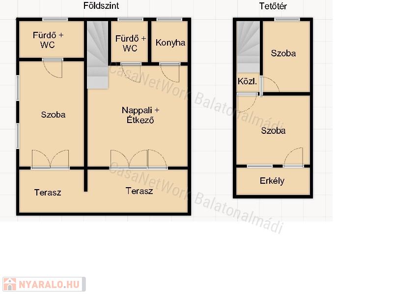 - külön bejáratú nagyobb része tetőtér beépítéses, 2+1 szobából, konyhából, fürdőszobából áll, másik része teljesen elszeparálva 1 szoba+fürdőszoba.
