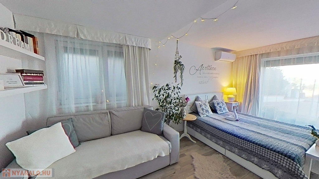 A D-i tájolású épület kétszintes, két különbejáratú, közel azonos méretű klimatizált apartmannal rendelkezik, belső hasznos területe összesen 70 m2. A szinteket egy külső lépcső kapcsolja össze. Az alsó szinten hálótér kádas fürdőkáddal és illemhelyiség került kialakításra. Az emeleten fürdőszoba, étkező-konyha, az ezeket összekapcsoló előtér, valamint hálószoba kapott helyet pazar panorámával a Balatonra. A ház alaprajzáról, a szobák méreteiről, elosztásáról a virtuális bemutató keretein belül tájékozódhat. Megtekintés előtt érdemes bejárni!