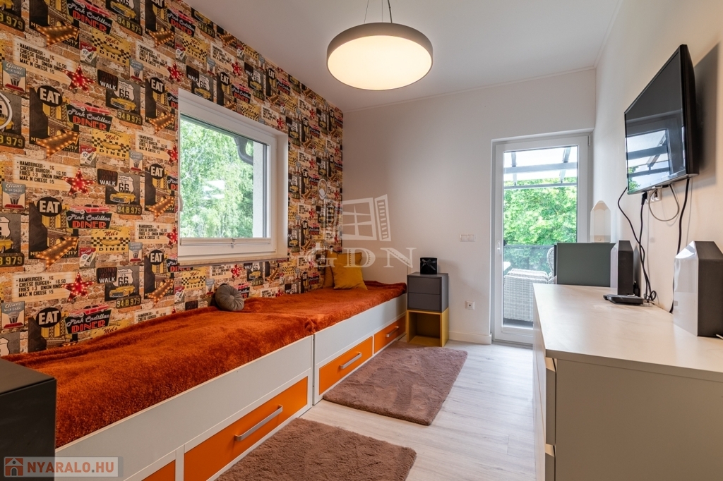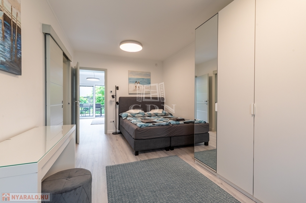 Az ingatlan kertész által gondozott kerttel, programozható öntözőrendszerrel, kamera-, beléptető- és riasztórendszerrel, valamint elektromos autó töltővel felszerelt.