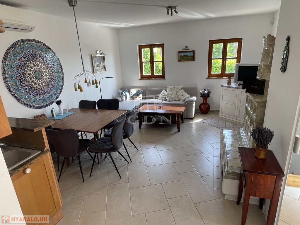 Földszint: nappali + étkező (19,8 m²) + konyha (7,2 m² ) légtérben split klímával, vendégszoba (8,9 m²) + zuhanyzós fürdő (2,4 m²)