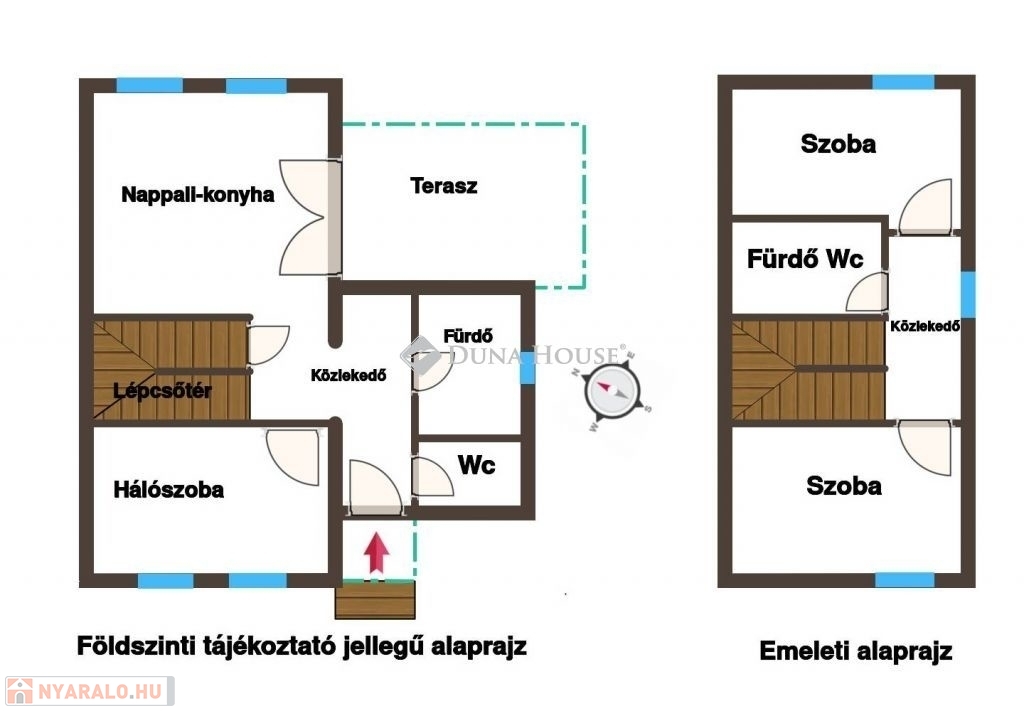 A földszinten szélfogó, fürdőszoba, különálló wc, nappali-konyha-étkező és egy hálószoba valamint a részben fedett terasz található.