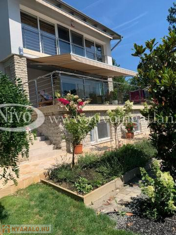 Balatonszepezden, Balatonra néző panorámával, két szintes plusz szuterénes, ~110 m2-es, nagy teraszos (31,08 m2), nyári konyhás, teljes körűen felújított, modern tervezésű nyaraló eladó.