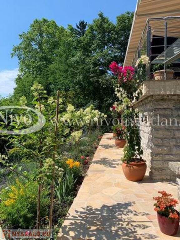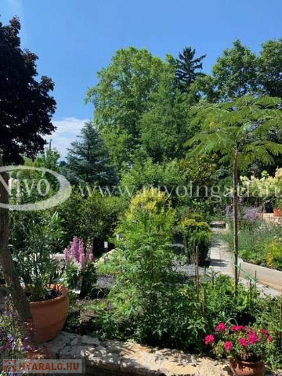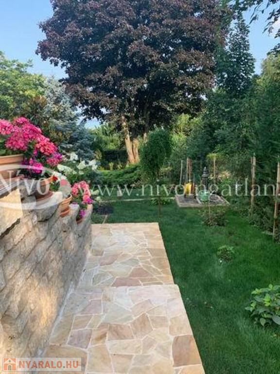 Az ingatlan 949 m2-es elektromos kapuval ellátott, körbekerített, parkosított, több mint 100 féle növénnyel beültetett (mediterrán növények, ritka fák, veteményes-és fűszerkert) gondosan karbantartott telken helyezkedik el, ahol kialakításra került egy hangulatos, teljesen felszerelt, gépesített, 21 m2-es nyári konyha, egy 24 m2-es kocsibeálló illetve több autó számára viacolor térkővel burkolt kocsibeálló is illetve még kerti zuhanyzó, bográcsozó-grillező és egy tároló kamra is megtalálható. A kertben van még fúrt kút és a locsolórendszer is ki van építve.