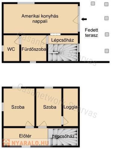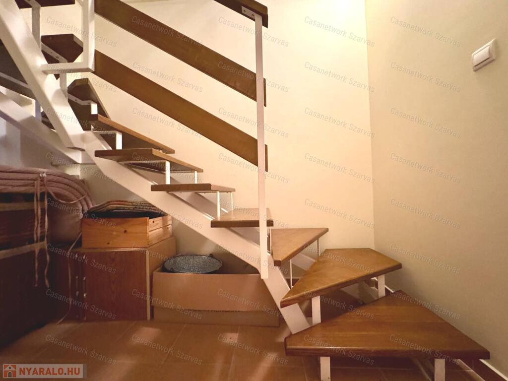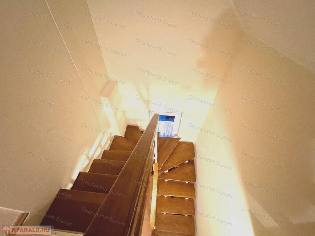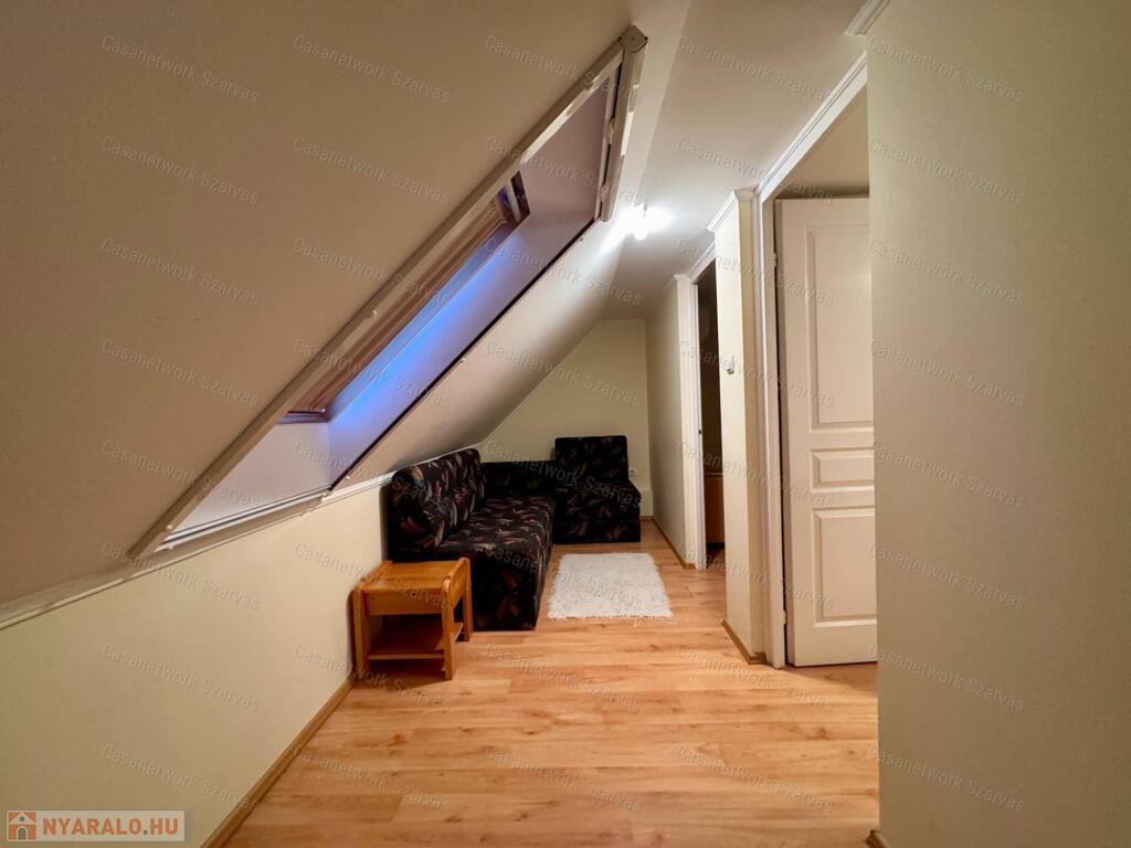 - Az ingatlan tetőterén folytatódik a lépcsőház, valamint kialakításra került egy előtér, két szoba és egy loggia szerkezet.