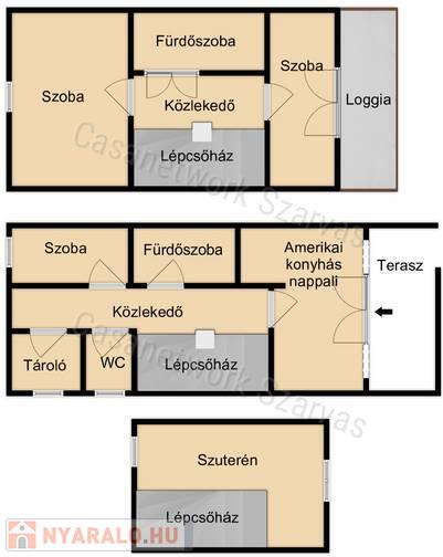 - Földszinti részén terasz, amerikai konyhás nappali, közlekedő, fürdőszoba illemhelyiséggel, külön illemhelyiség, tároló, szoba, lépcsőház található.
