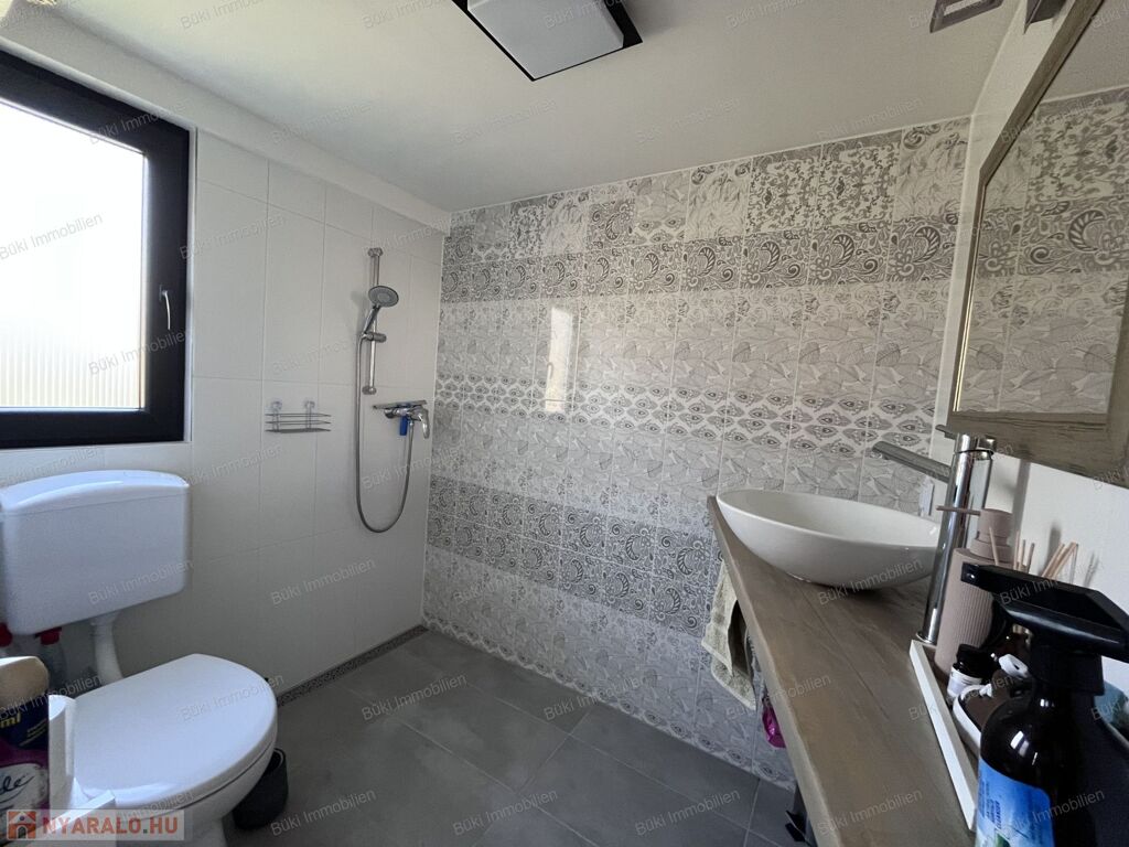 Az ingatlan igazi különlegessége a 12 m²-es fedett terasz, amely a ház meghosszabbításaként tökéletes helyszín a reggeli kávézáshoz vagy esti borozáshoz. A házat sziklakerttel és dísznövényekkel gazdagított udvar öleli körbe, ahol kényelmes parkolási lehetőség is kialakításra került.
