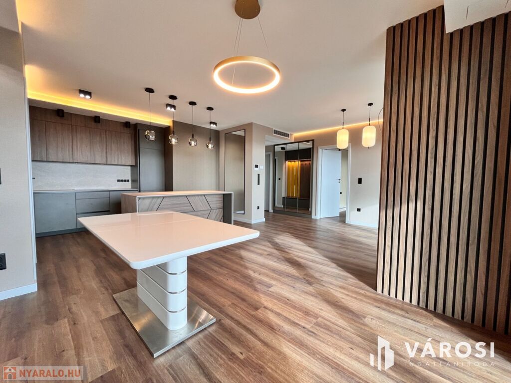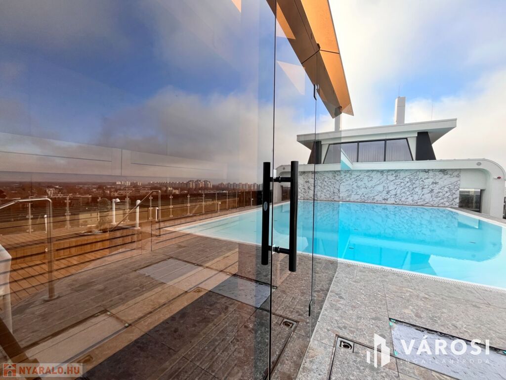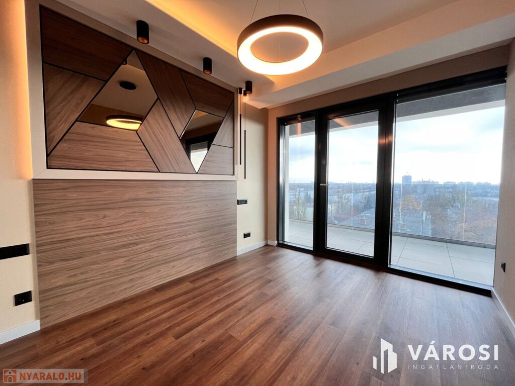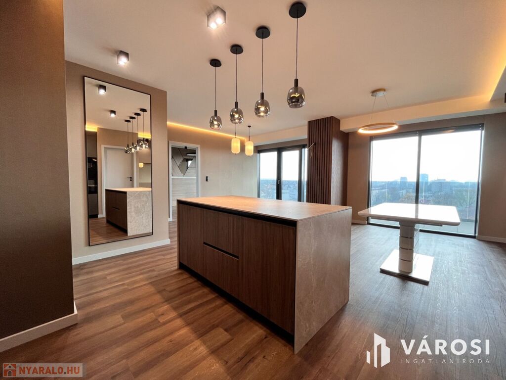 Debrecen egyik legfrekventáltabb sugárútján, az ikonikus Egyetem Tower társasház legfelső lakószintjén (8. emelet) eladó egy új építésű, 91 m²-es, prémium kategóriás luxuslakás.
