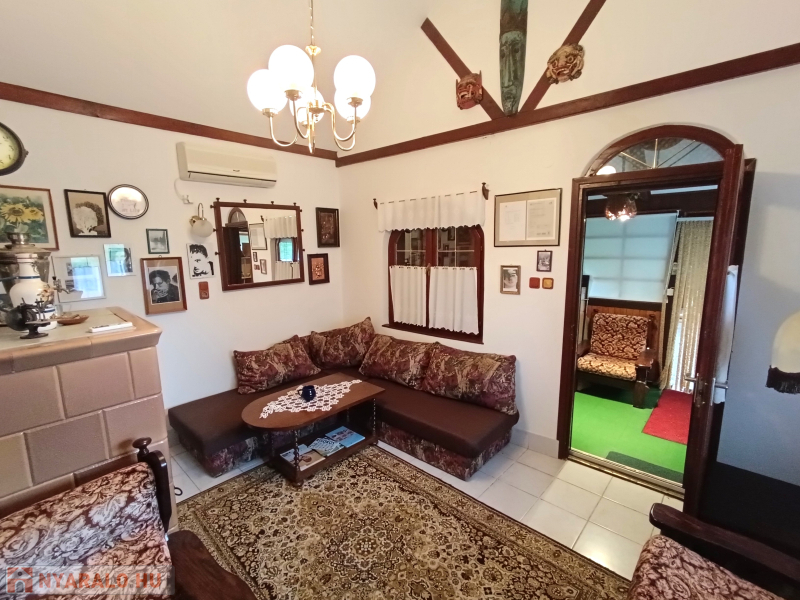 Jobb oldali, téglaépítésű lakrész: nappali, galériázott háló, zuhanyzós fürdőszoba + WC, tágas előtér, hálószoba. Fűtése: klíma és cserépkályha