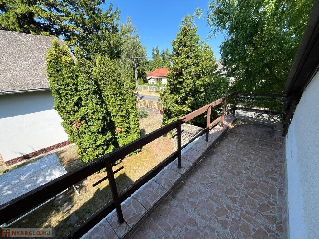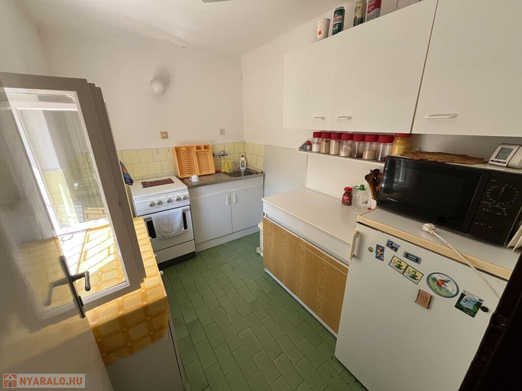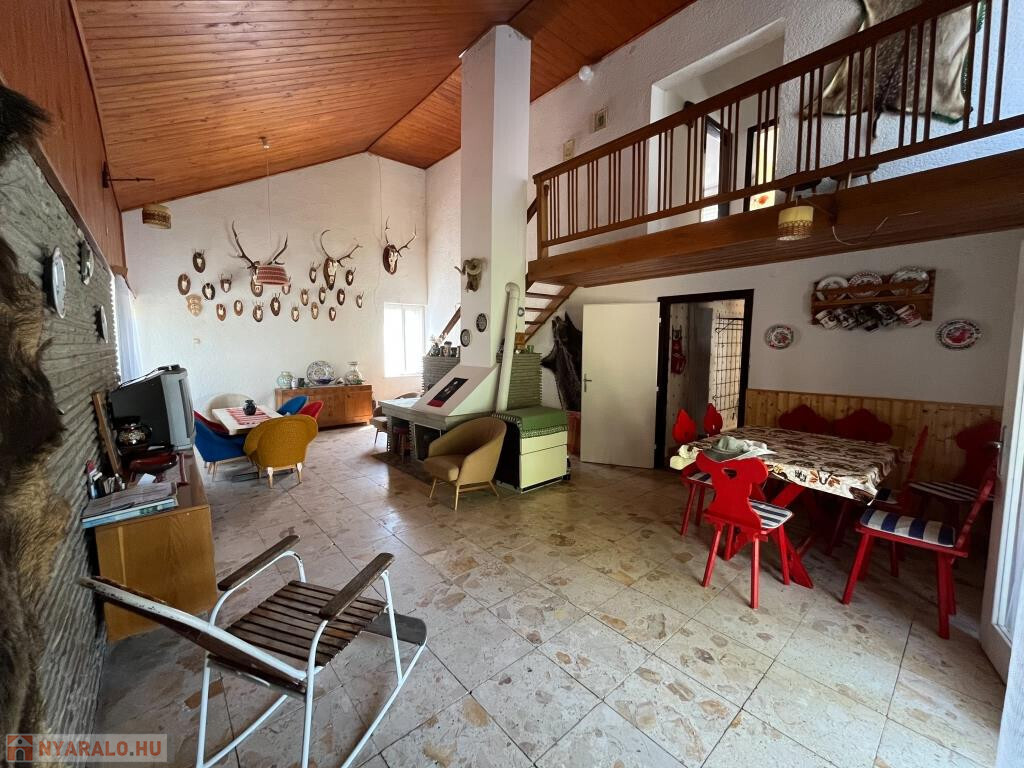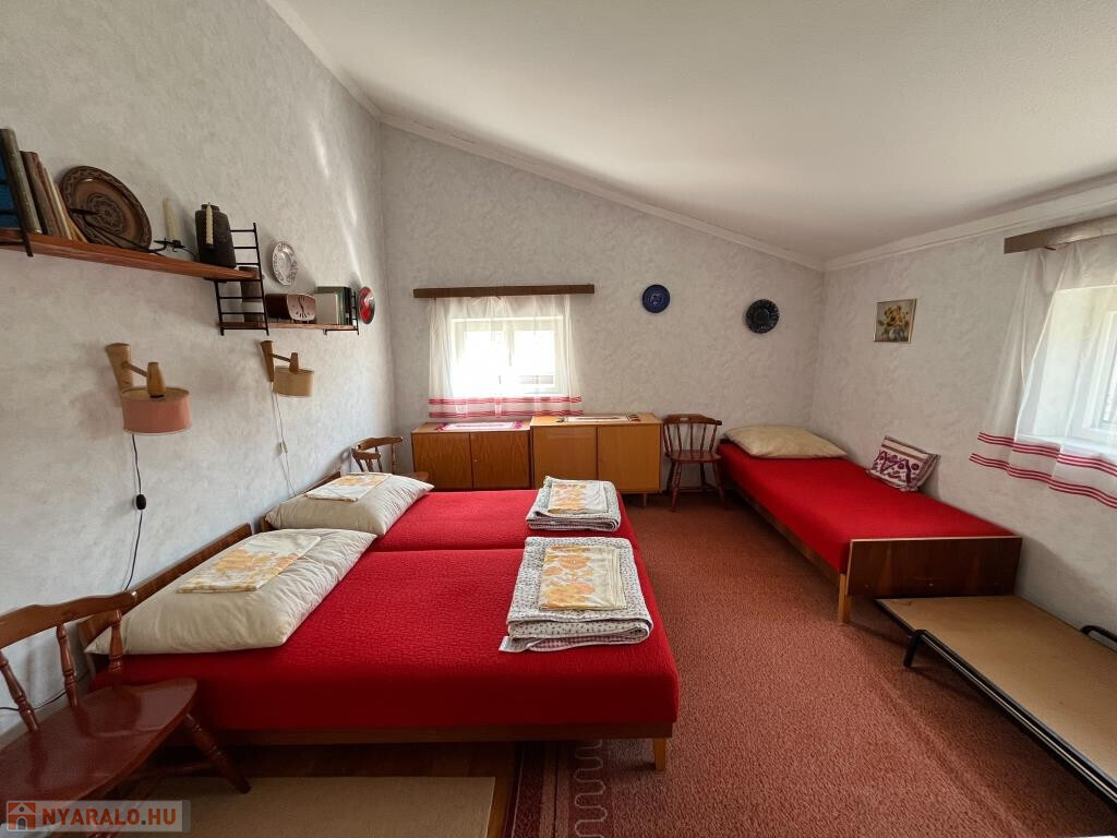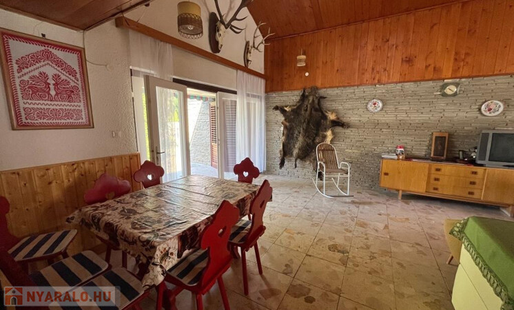 Fonyódliget egyik csendes, partközeli utcájában, a Thököly utcában kínáljuk megvételre ezt a kétszintes, 110 m2-es, jó elosztású családi nyaralót. Impozáns nappalijában harmonikusan van jelen a természetes fa- és a kőburkolat, a tágas, világos belső tér igazán barátságos, nagyobb társaságnak is kényelmes helyet ad. Terasz is csatlakozik hozzá. A földszinten ki van még alakítva egy háló, a zuhanyzós fürdő és a konyha; minden helyiség egy kis előtérből nyílik, ahová bejárati ajtó is vezet. Az emeletre a nappaliból megy fel a lépcső, itt szintén a közlekedőből nyílik két szoba, a WC, valamint egy erkély. A ház jó állapotú, a kerttel együtt szépen karbantartott. A közművek közül a gáz kivételéven minden bevezetésre került. A telek teljesen sík, 459 m2, füves, parkos. Kifejezetten jó helyen fekszik a nyaraló, a Balaton kb. 200 m, vagyis 3-4 perc sétával elérhető a strand. A környék rendezett, az utca csendes, nyugodt, a főút távolabb fut.