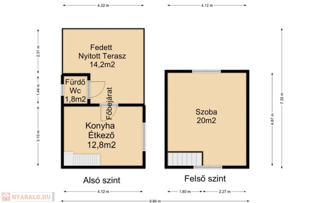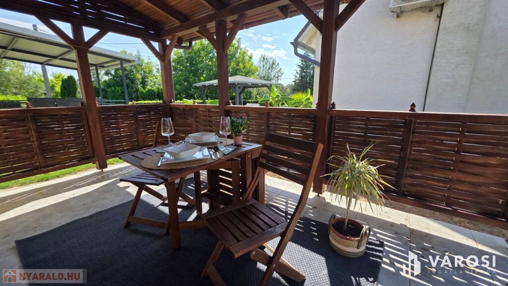 Az épülethez tartozik egy 14.2 m²-es, fedett terasz is mely tökéletes helyszín a nyugodt reggelikhez vagy esti beszélgetésekhez.