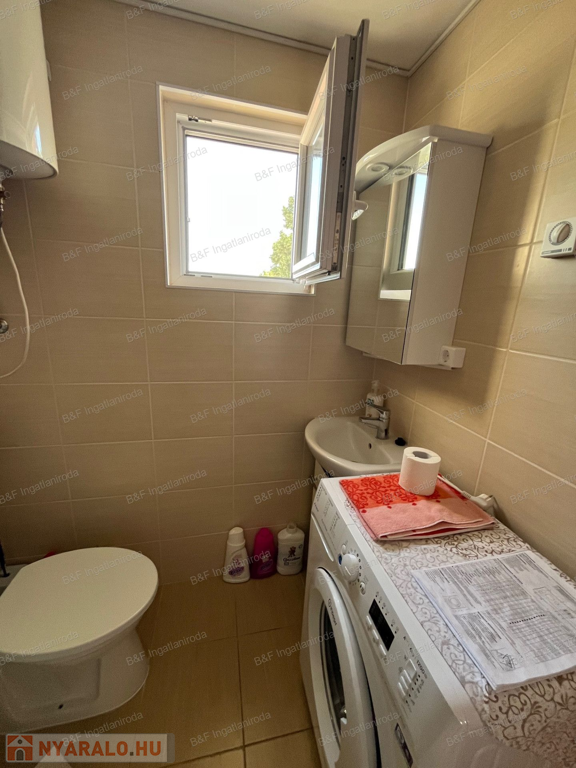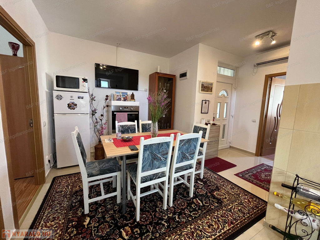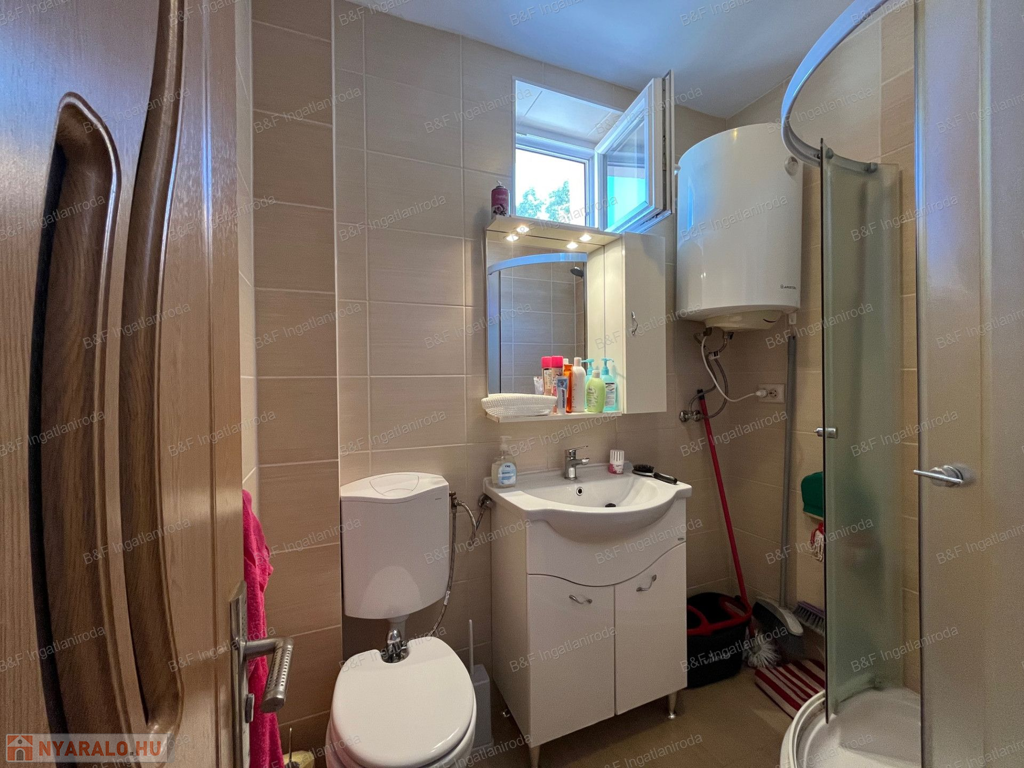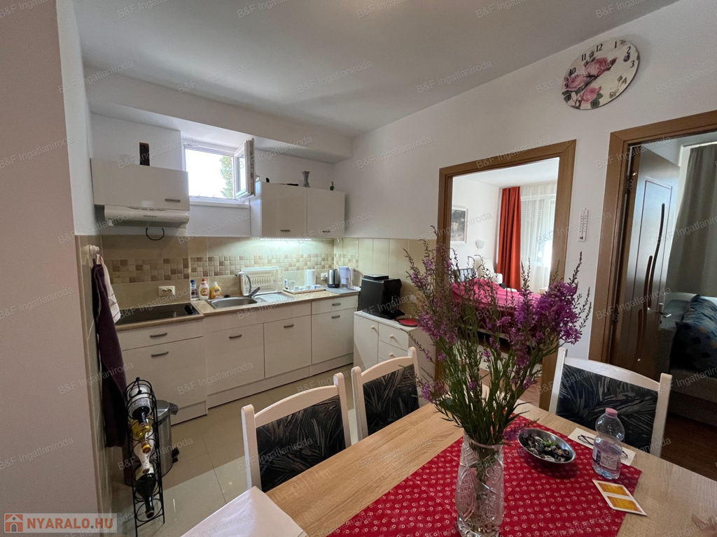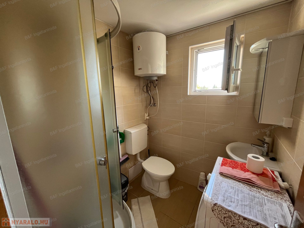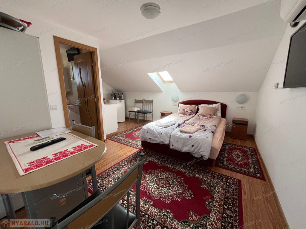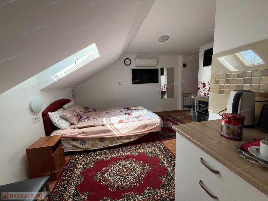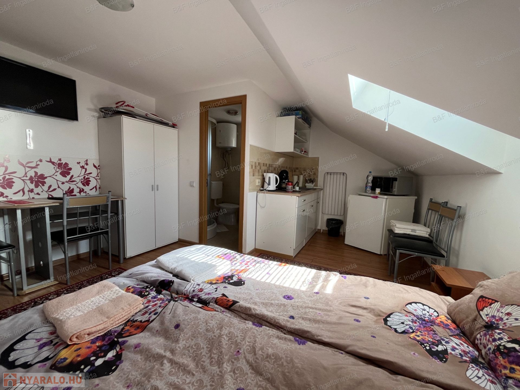 - 20,4 négyzetméterű tetőtéri apartman nappali-konyha-étkezővel, wc-s fürdőszobával rendelkezik.
