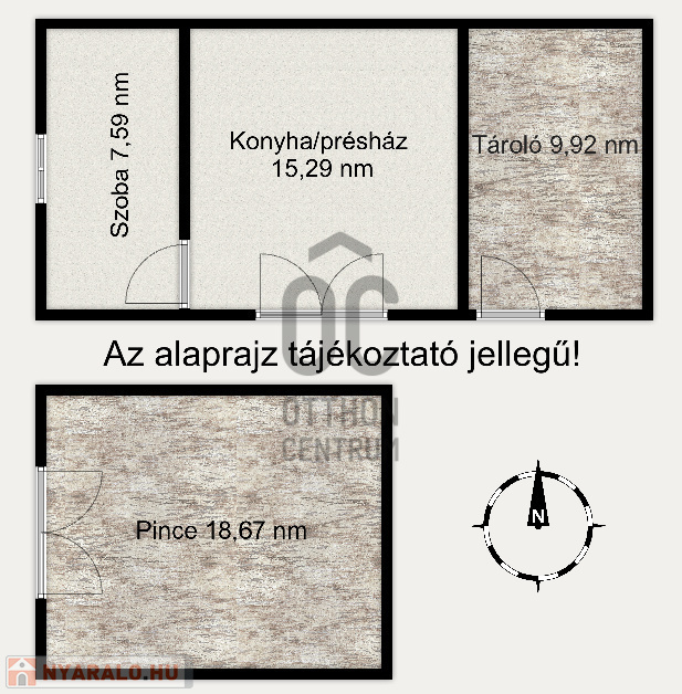 Az épület két szintes, alul egy 18,67 nm-es borospince, fent pedig egy 7,59 nm-es szoba, 15,29 nm-es konyha/présház, illetve külön bejárattal egy 9,92 nm-es tároló helyiség található.
