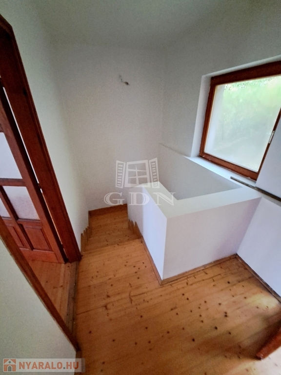 -kényelmes fa lépcső az emeletre, ahol 2 hálószoba, fürdőszoba, erkély, terasz található