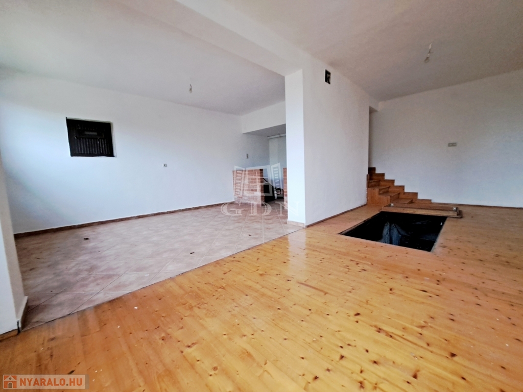 -a földszinten amerikai konyha-nappali, melynek közepén lépcsős lejárat a csodálatosan kifaragott, villanyvezetékelt 112m2-es pincébe