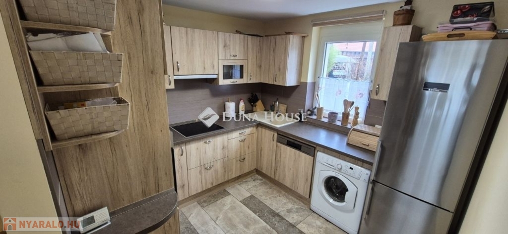 A nagyobbik, 100 nm-es ház alsó szintjén egy napfényes amerikai konyhás nappali, előszoba, fürdőszoba és egy wc kapott helyet. Az emeleten egy fürdő, wc, gardrob, tároló, és jelenleg 2 halószoba van, de a nagyobb háló opcionálisan megosztható. Úgy lett tervezve, ajtók, kapcsolok tekintetében, hogy csak egy válaszfalat kell felépíteni és máris 3 élhető méretű hálószoba áll az itt lakók rendelkezésére. Az ingatlanban a melegről a gazdaságos puffertartállyal ellátott kondenzációs gázkazán mellett egy hangulatos kandalló is gondoskodik, ami az otthon melegét és a természetesség érzetét hivatott fokozni. Padlófűtés található az alsó és felső szinten egyaránt, ami külön-külön is szabályozható. A nyári melegben egy modern hűtő-fűtő klíma gondoskodik az itt lakók komfort érzetéről. A tágas, gépesített konyhabútorral felszerelt konyha minden igényt kielégít, legyen szó egy gyors reggeliről vagy egy nagyobb családi vacsoráról. A tágas otthonunk békés kertre néző hatalmas Schüco hőszigetelt ablakokkal és hőszigetelt redőnnyel büszkélkedhet, melyek garantálják a nyugodt és természetközeli életet.