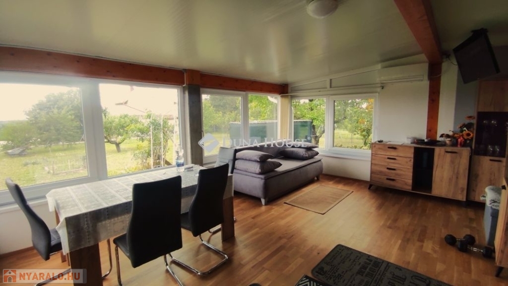 Mohácson a szőlőhegyen ház eladó!Dél-Baranyában Mohács közelében eladó ez a bájos kis nyaraló. Tulajdonosai amikor 20 évvel ezelőtt megvásárolták ezt a házat, hozzépítettek egy 24m2-es nappalit. Ez a helyiség adja meg az egész ház hangulatát. Nagy üveg tolóablakai télen-nyáron biztosítják a kitűnő fényviszonyokat. Innen nyílik egy újabb szoba, konyha, fürdő wc-vel. Ezek a helyiségek vannak a földszinten és ha felmegyünk a falépcsőn a tetőtérben még két szoba található. Mindkettőből ajtó nyílik a fenti teraszra. Az 5m2-es szép kilátásunk van az udvarra, és a távoli Dunára is. Az északi oldalon az utca felől beállhatunk az a fedett garázsba ami közvetlen a ház falához csatlakozik. A ház téglából épült, és szigetelt. A tető cserépfedéses, illetve a hozzáépítésnél szigetelt lemezfedéssel oldották meg. A nyílászárók műanyagok ,a burkolatok a földszinten kerámia, az emeleten pedig laminált padló. Fűtését egy kandalló biztosítja. Az ingatlan jól megközelíthető télen-nyáron is. Ha megtettszett vagy további kérdései lennének hívjon!