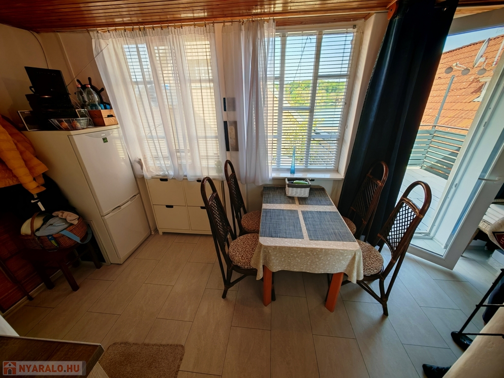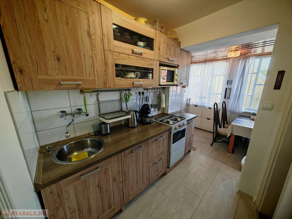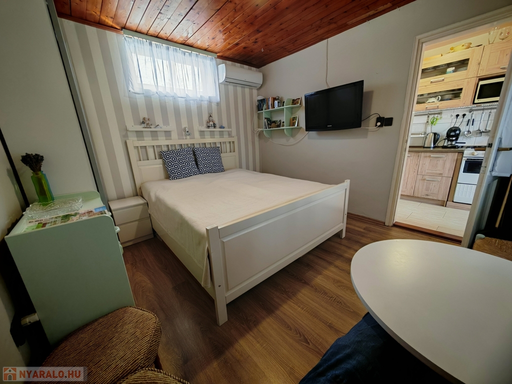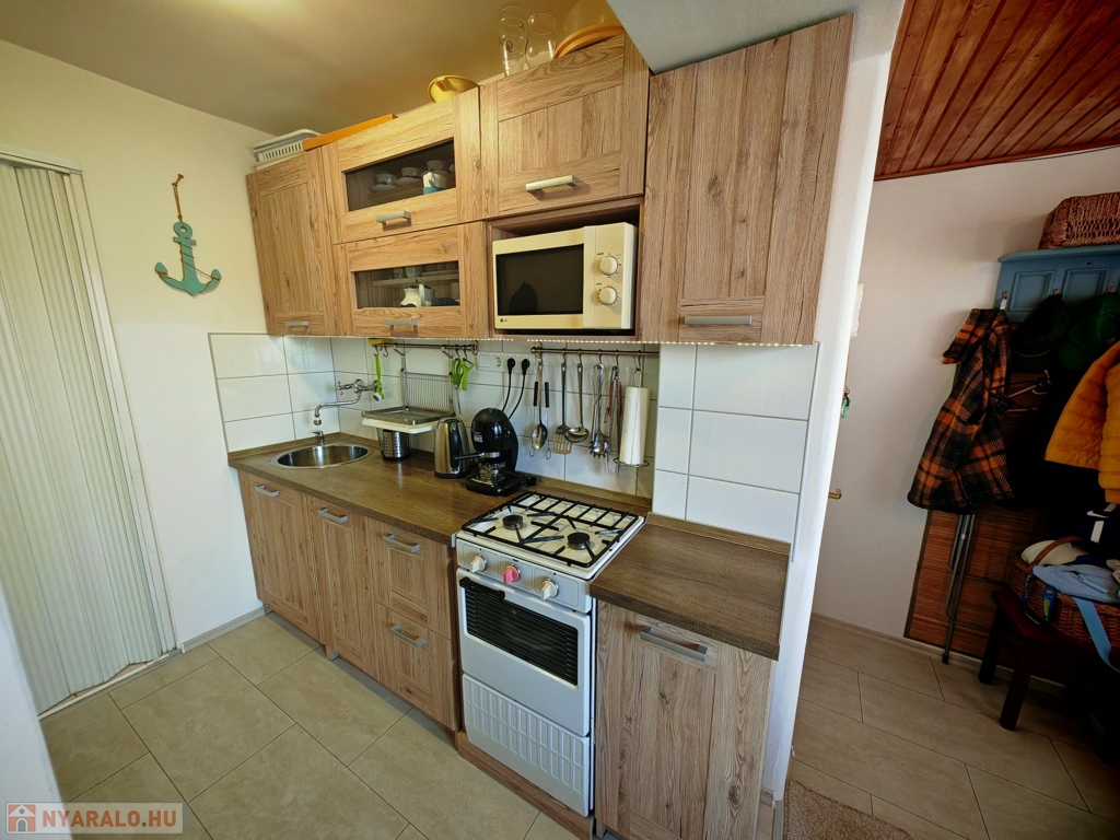 A házban szoba, konyha, fürdő-WC, valamint egy kis étkezőként és szobaként használható helyiség kapott helyet. A fűtés-hűtést új klímaberendezés biztosítja, a melegvízről bojler gondoskodik. A tetőt tavaly cserélték és szigetelték. Gázcsonk az udvaron belül.