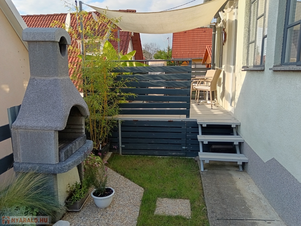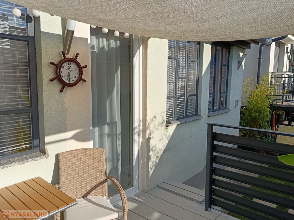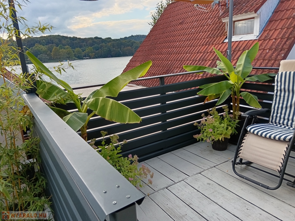A 80 m²-es telek igényesen és praktikusan lett kialakítva. A tóra néző, tágas terasz nyugodt pihenést kínál, ezen kívül fedett terasz, tároló, hintaágy és kemence is található rajta – utóbbiak igény szerint megvásárolhatók.