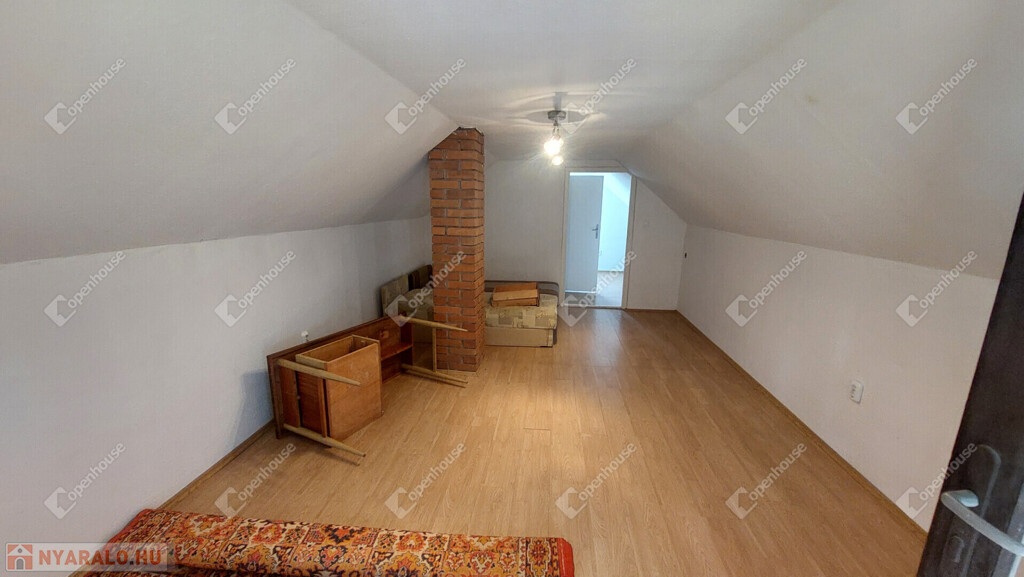 Emelet: egybenyitott, de könnyen két szobára osztható helyiség + nagy erkély.