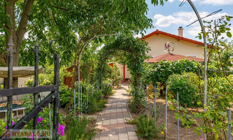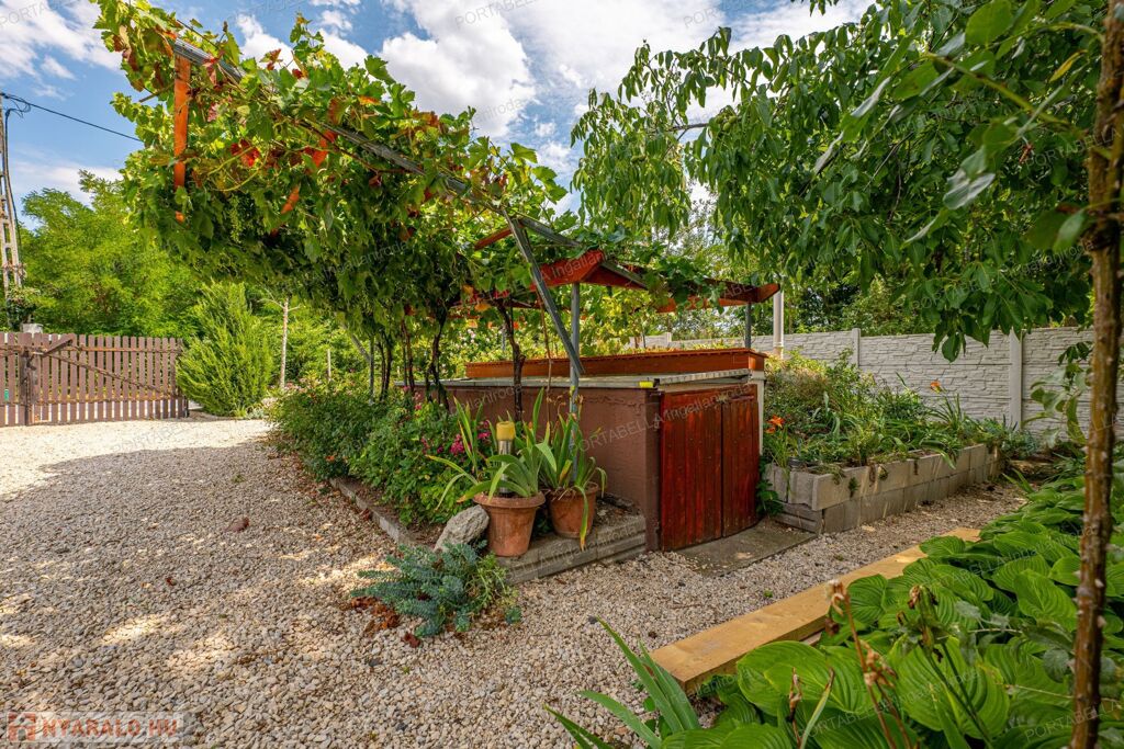 Az udvarban több praktikus melléképület is található: egy nagy szerszámos tároló, egy külön fa tároló, valamint egy növényekkel körbeölelt, diszkréten elhelyezett kültéri WC, amely szinte észrevétlenül simul bele a környezetbe. A kert igazi ékessége a fedett kerti kiülő, amelyet gyönyörű szőlőlugas fut be, és ahol sütési-főzési lehetőség is adott – tökéletes hely a közös étkezésekhez, baráti beszélgetésekhez vagy családi összejövetelekhez.
