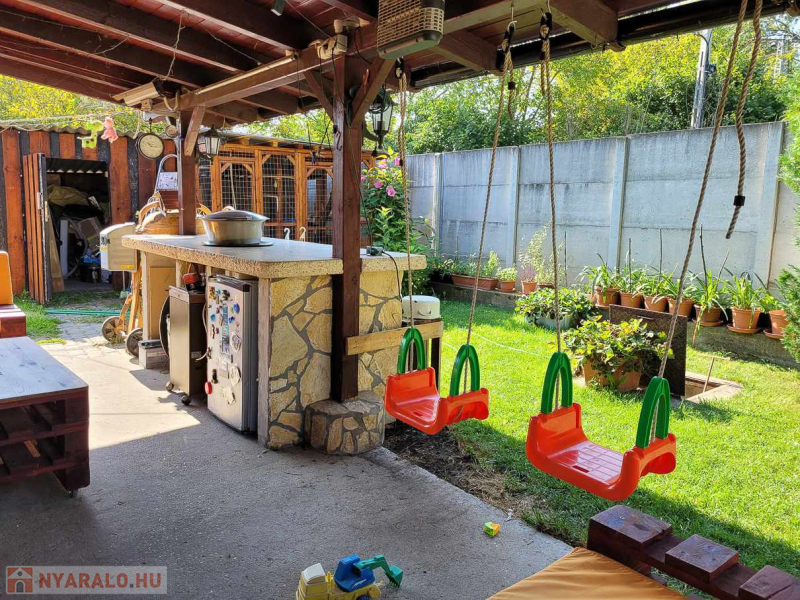 A házhoz tartozik egy kb 30 nm-es terasz, ahol a pult alatt hűtő van és kis tárolók, ahová a sütéshez, tálaláshoz szükséges dolgokat tehetik.