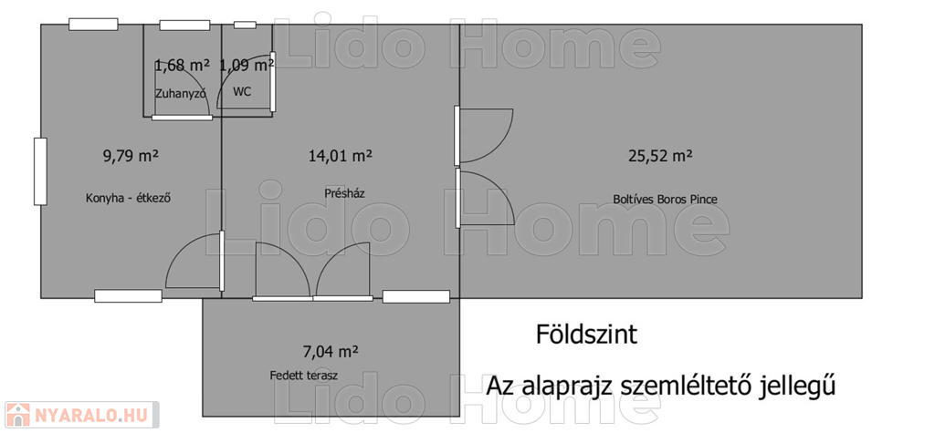 - földszint: présház, konyha+étkező, fürdőszoba zuhanyzóval, külön WC, közlekedő, boltíves boros pince, panorámás fedett terasz
