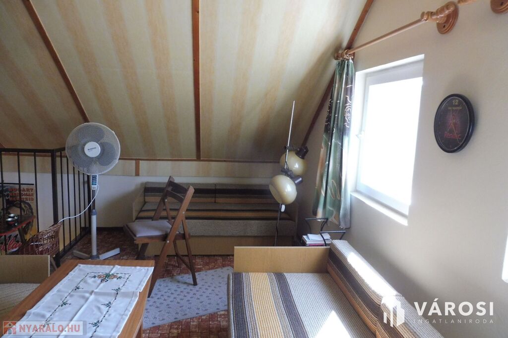 A 30 négyzetméter alapterületű ingatlan,melynek tetőtere ugyanebben a méretben kialakított és rendelkezik még egy fedett 10 négyzetméteres terasszal,jó választás lehet azoknak akik a Sziksós Tó közelében keresnek ingatlant.A gondos tulajdonosoknak köszönhetően a házikó rendkívül jó állapotban,óvott és vigyázott minőségben,rendezett kertel és szép fekvésű hangulatos benapozású területtel várja az érdeklődőket.Az épület mind két szintje beépített és használható.Fontos megjegyeznem,hogy a 416 négyzetméteres telken még található egy külön tároló ami roppant praktikus lehet,kerti-szerszámoknak illetve nyáron használatos tárgyaknak.Az ingatlan rendkívül jó helyen található,hiszen a Strand bejárata és a Buszmegálló pár perc séta távolság.A házban a gáz nincs bevezetve,ugyanakkor a telekhatáron rendelkezik felállással,ennek jelentősége akkor lesz ha esetleg az új tulajdonos bővítésben és téliesítésben gondolkozik.