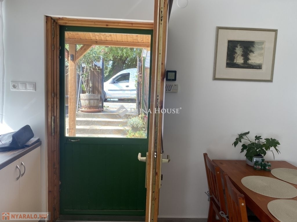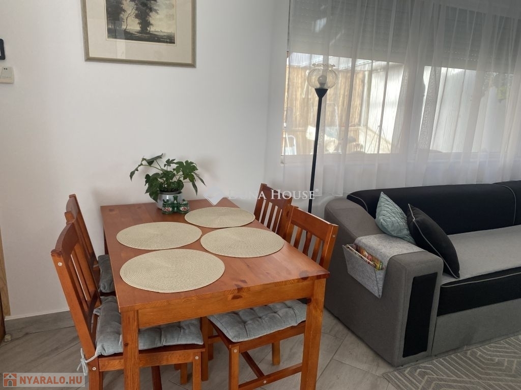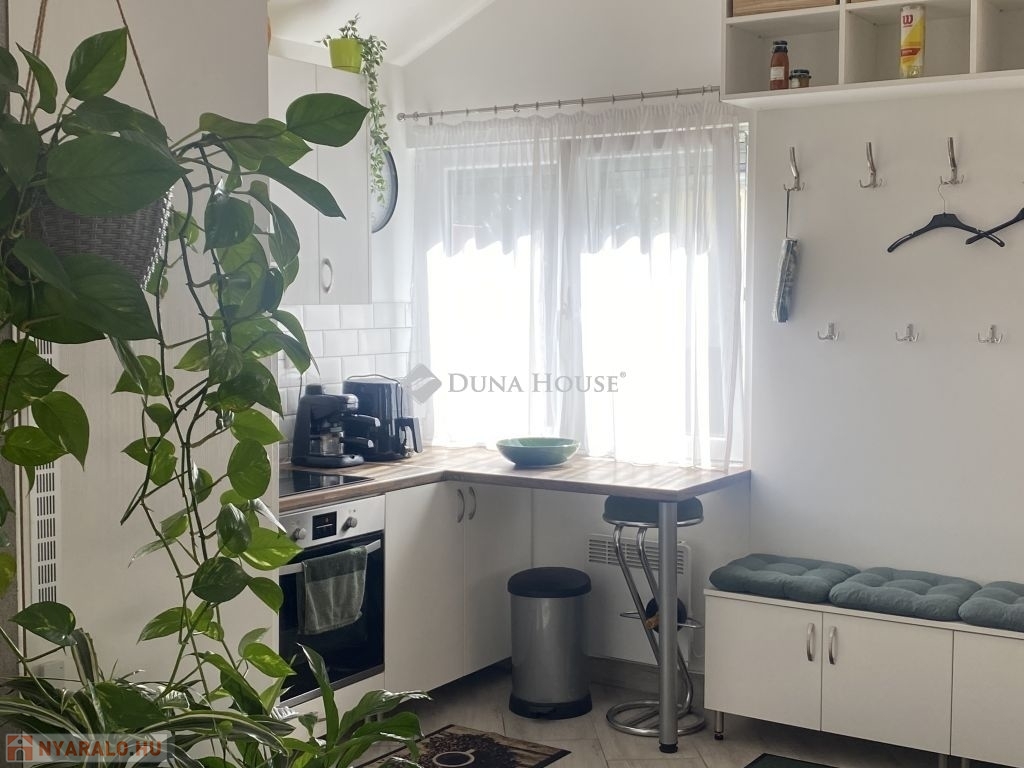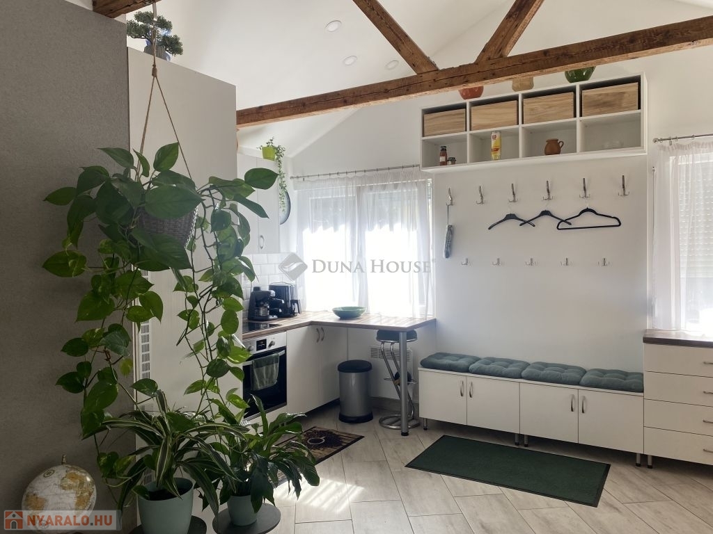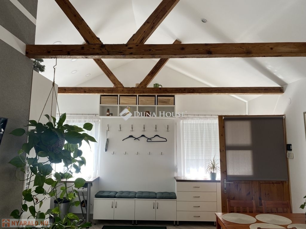 Elrendezése:Félig polikarbonáttal és félig lambériával fedett teraszról ( nyári konyha) lépunk a világos modern dizájnal és nagy belmagassággal rendelkező amerikai konyhás nappaliba. Melyből nyílik a tető ablakkal ellátott, világos toalettes fürdő. Valamint a hangulatos hálószoba.