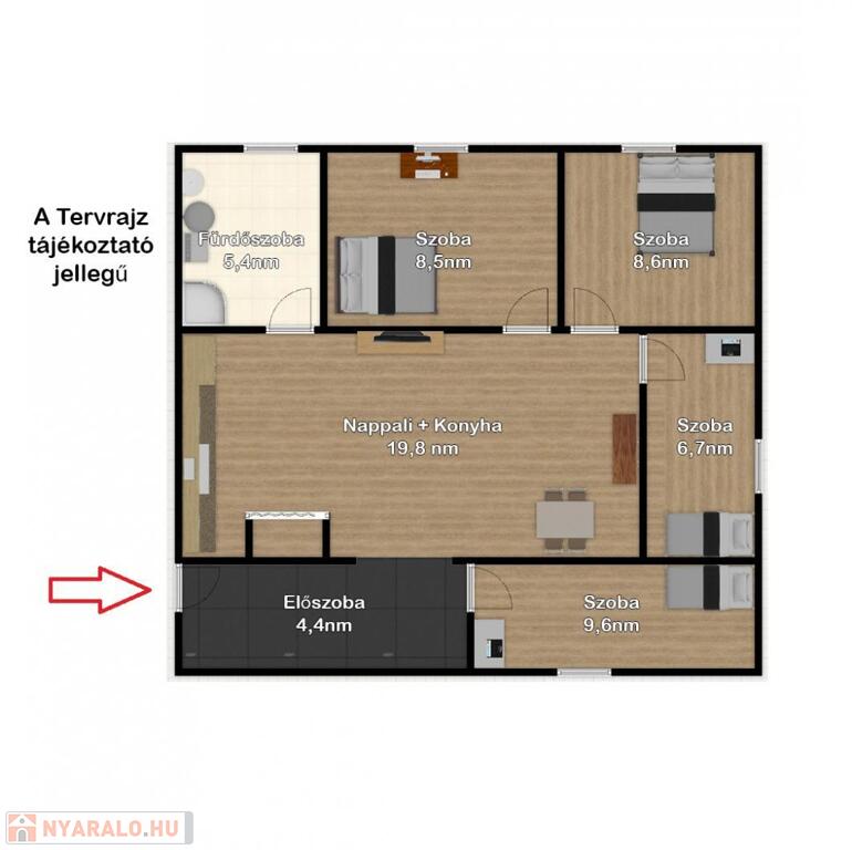 Elrendezés: 4 szoba + nappali-konyha egyben