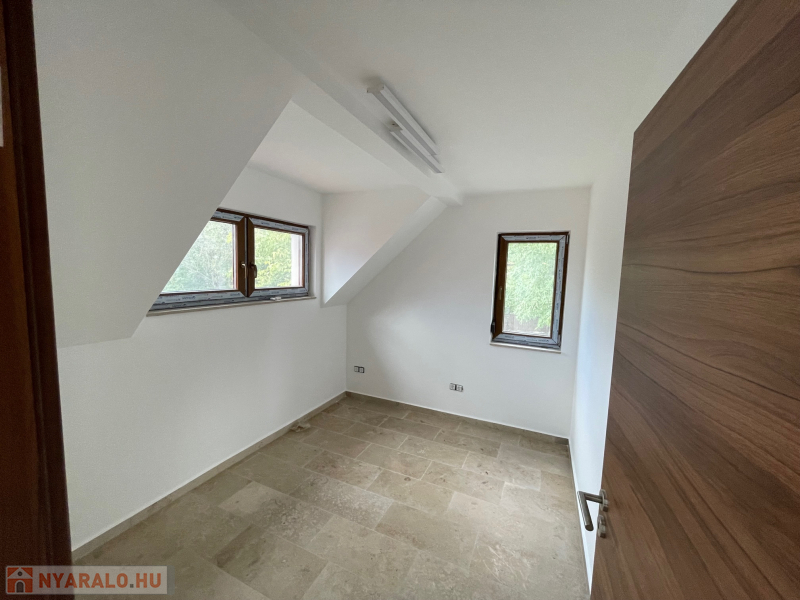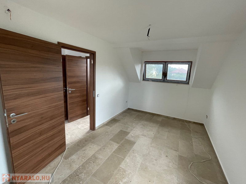 Helyiségei: a földszinten amerikai konyhás nappali, melyhez egy 21 m2-es és egy 12 m2-es terasz kapcsolódik, egy hálószoba, egy zuhanyzós fürdőszoba + WC, az emeleten pedig 1+2 hálószoba, háztartási helyiség és egy WC található.