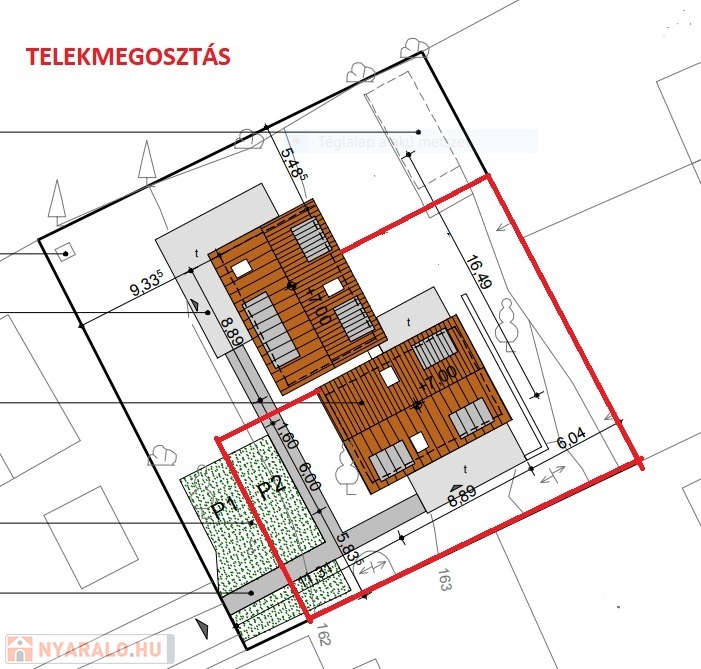 A 720 m2-es teljes telek területen két, egymástól jól elkülönített ház áll, amelynek nincs közös fala, a két épületet egy kis tárolóhelyiség köti össze. A két épület 6,00 x 8,96 m befoglaló alapterületű, egymástól tartószerkezetileg független, földszintes+ tetőteres, magas tetős, kétegységes üdülőépület, amely két család számára megfelelő térkapcsolatokkal rendelkezik.