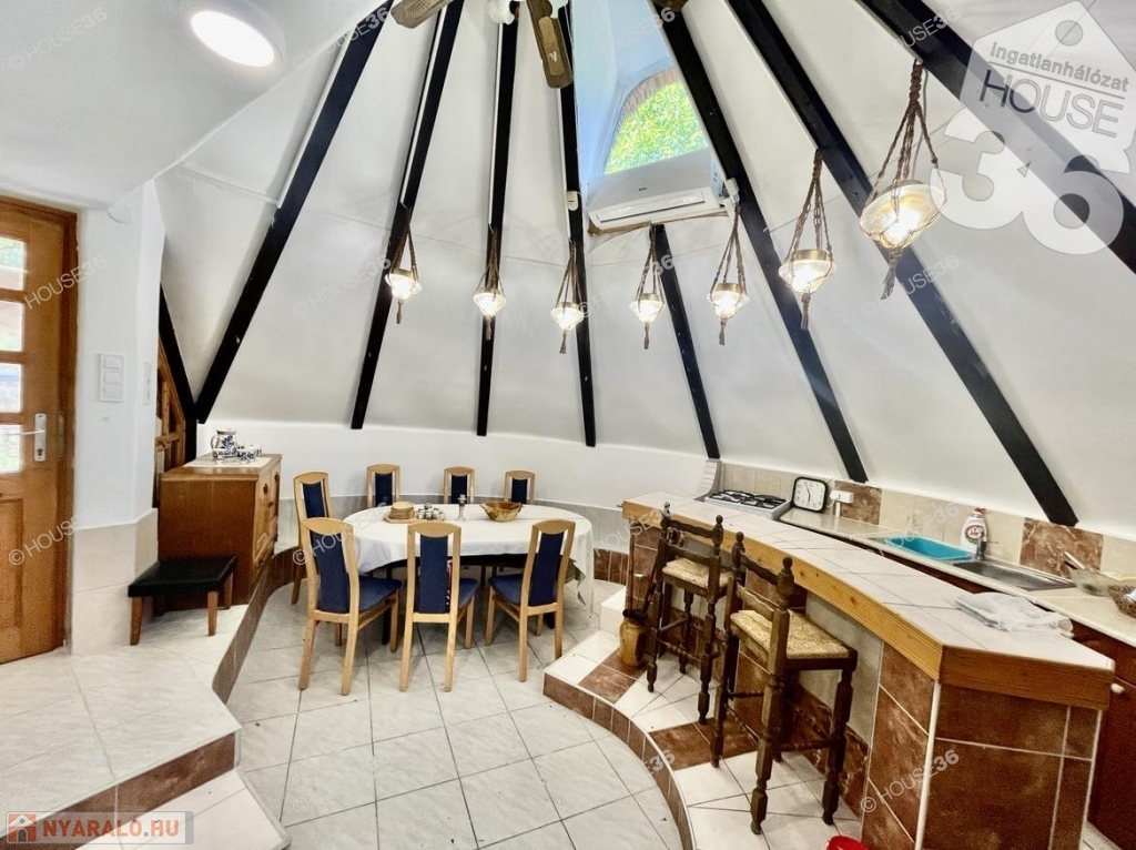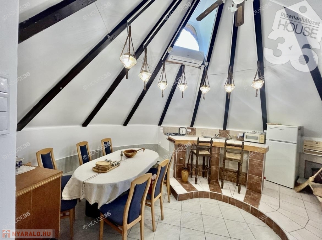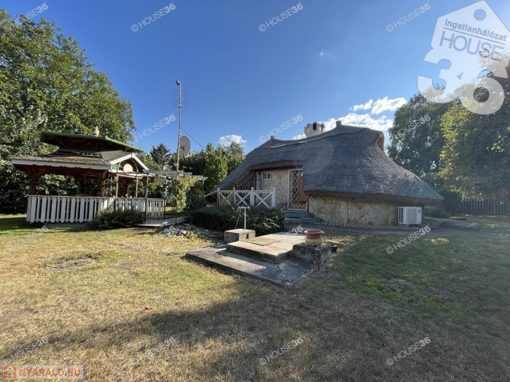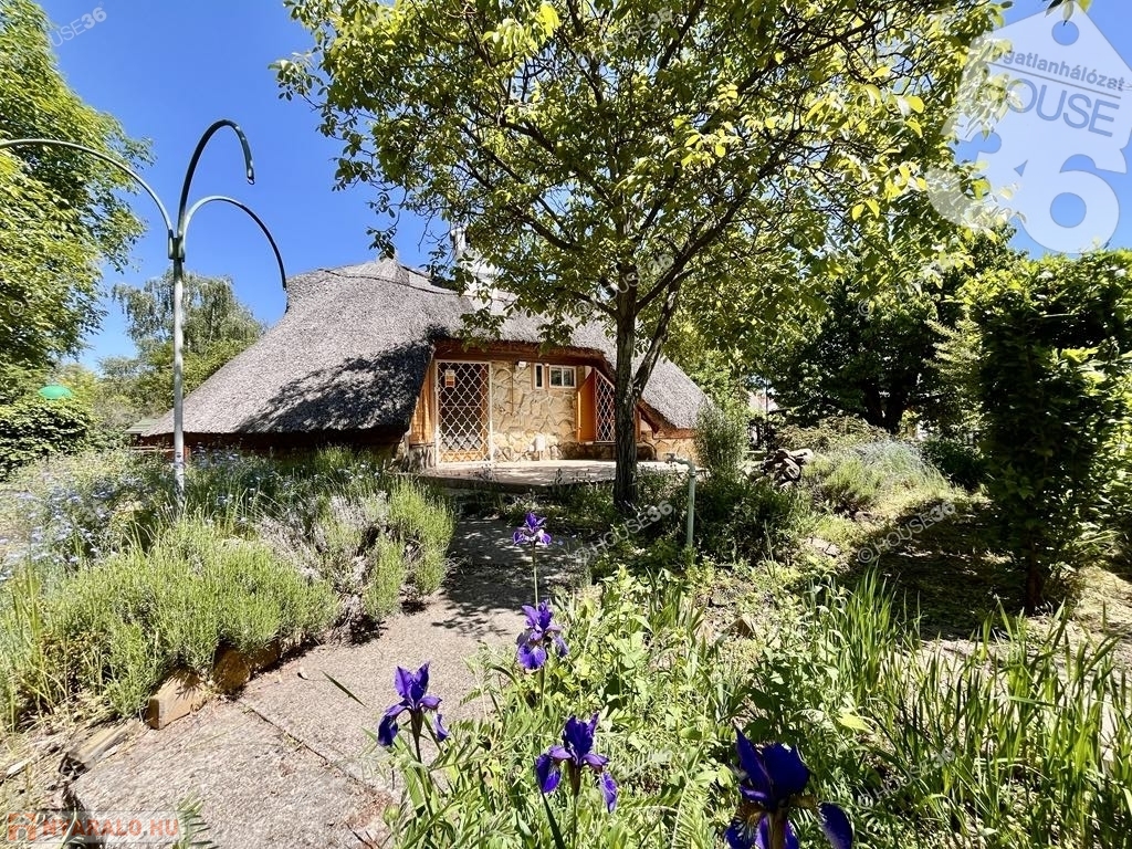 Egyedi megjelenésű, KÜLÖNLEGES formájú lakóépület: teljes körűen felújított nádtető fedés, terméskő burkolat!