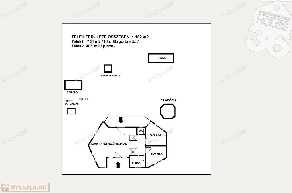 A telkek együttes mérete: 1162 m2 (754 + 408 m2);
