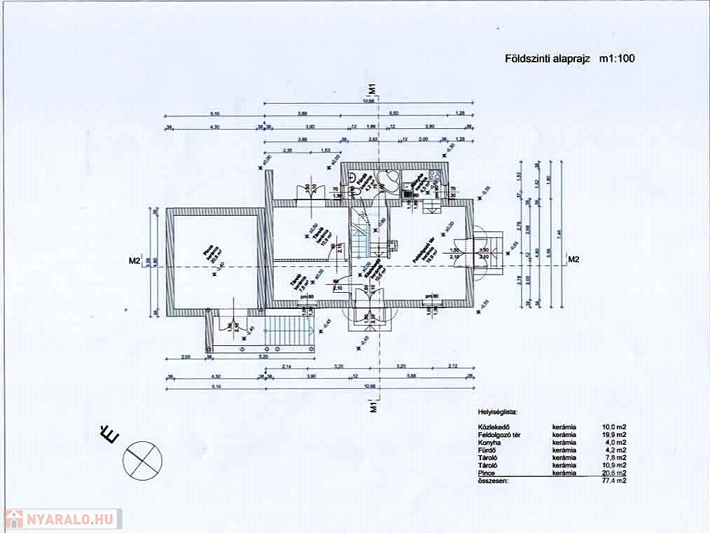 Földszint 57,4 m2. Nappali-étkező, konyha, fürdőszoba, hálószoba, közlekedő, lépcsőház.