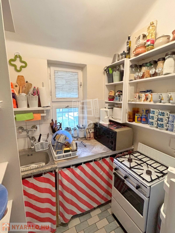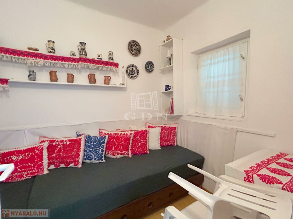 4846. Velencefürdőn a számozott utcák felső szakaszában fekvő, 541 m2-es, 20%-ban beépíthető telken, 60-as években épült, karbantartott, jó állapotú, nappali + 2 félszobás + a tetőtérben kialakított 1 hálószobás, 33 m2 nettó alapterületű, tégla építésű, zsindely fedésű, hordozható cserépkályhával fűthető hétvégi ház, 9 m2-es terasszal, tároló helyiséggel eladó. A gondozott, szép kertben termő gyümölcsfák, örökzöld növényezet, betonozott kerti pince és faház tároló találhatók. Parkolás telken belül is lehetséges. Bővítéssel a nyaraló lakóházzá is átépíthető. Irányár: 38,5 Mft