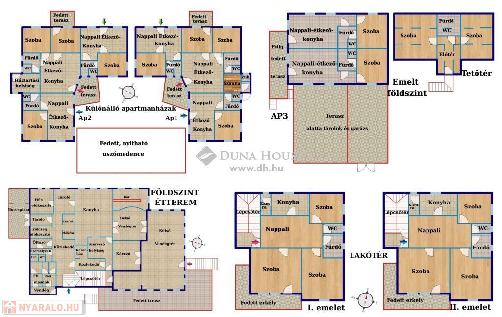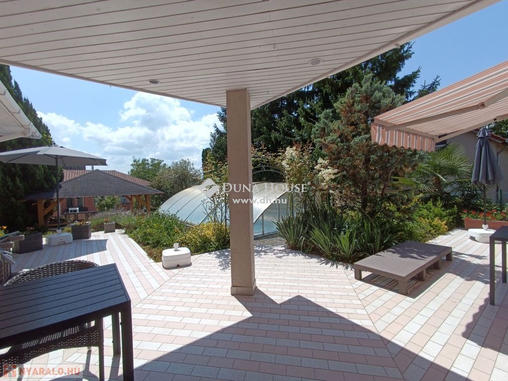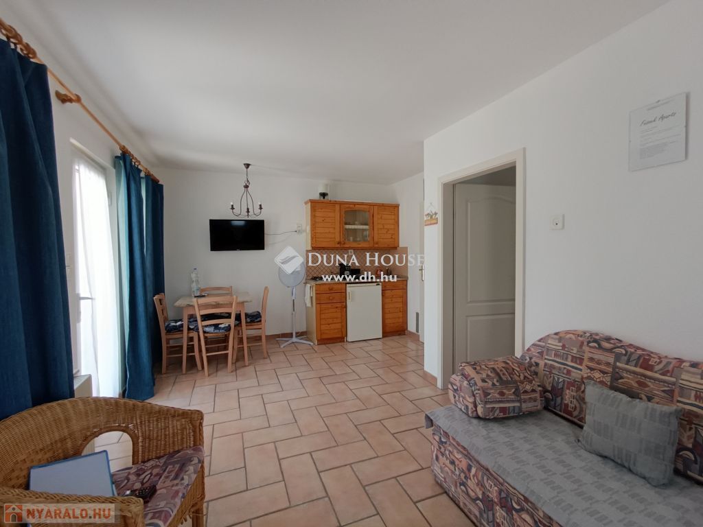 Vonyarcvashegy Balaton-közeli részén eladó egy lakóházat, több apartmanházat és éttermet magába foglaló üdülő komplexum aminek nettó összmérete 837nm, mindez 3 egymás melletti telken, melynek összmérete 2945nm. A vendégfogadásra kialakított két skandináv stílusú apartmanház melynek egyenkénti mérete 104,6nm magába foglal 3 külön bejáratú apartmant, amelyikből kettő amerikai konyhás nappalival, fürdő külön WC-vel, egy hálószobával és egy darab két hálószobást apartman. Kívülről kapcsolódik hozzá egy háztartási helyiség és egy finn szauna. A két apartmanházat egy külön kis utcából is meg lehet közelíteni ahol a gépkocsiknak van parkolási lehetőség. A két apartmanházat mediterrán stílusú kert veszi körül, virágokkal fákkal ahol egy fa pavilon, kiülő, grillező és egy 5x12m-es fedett, de nyitható úszómedence is található.