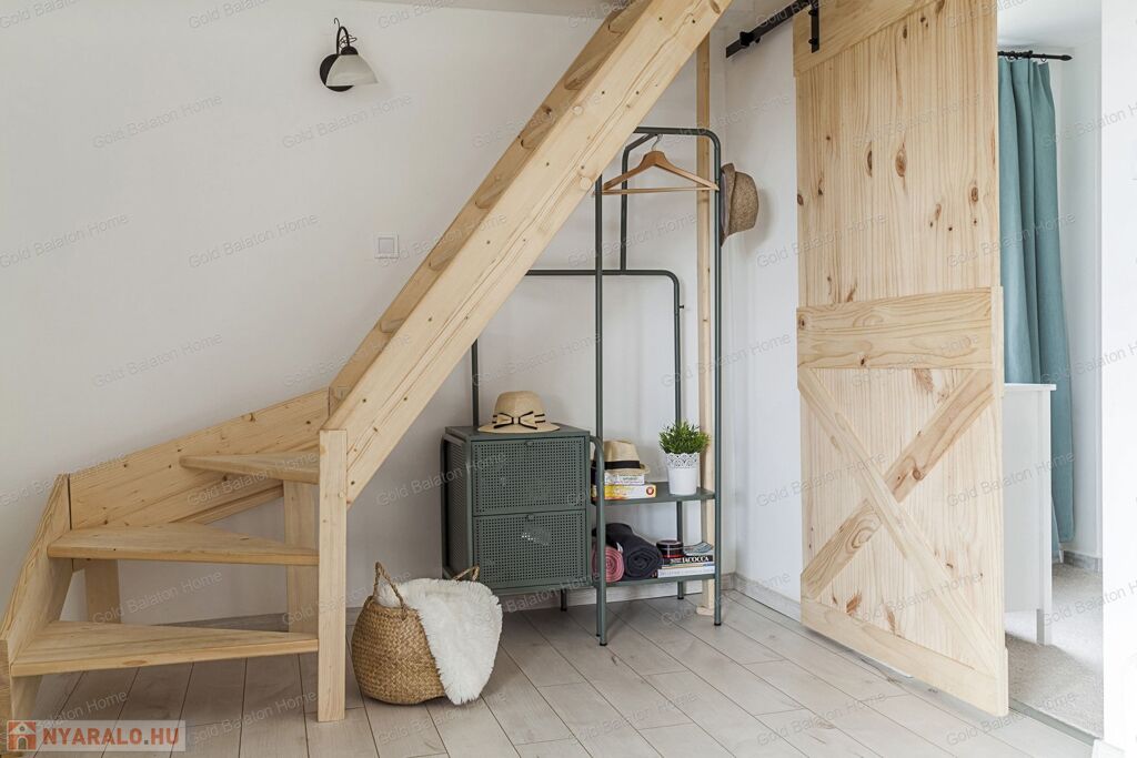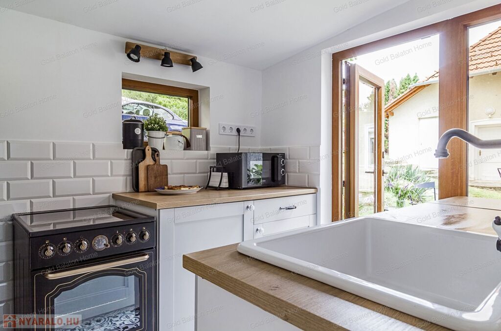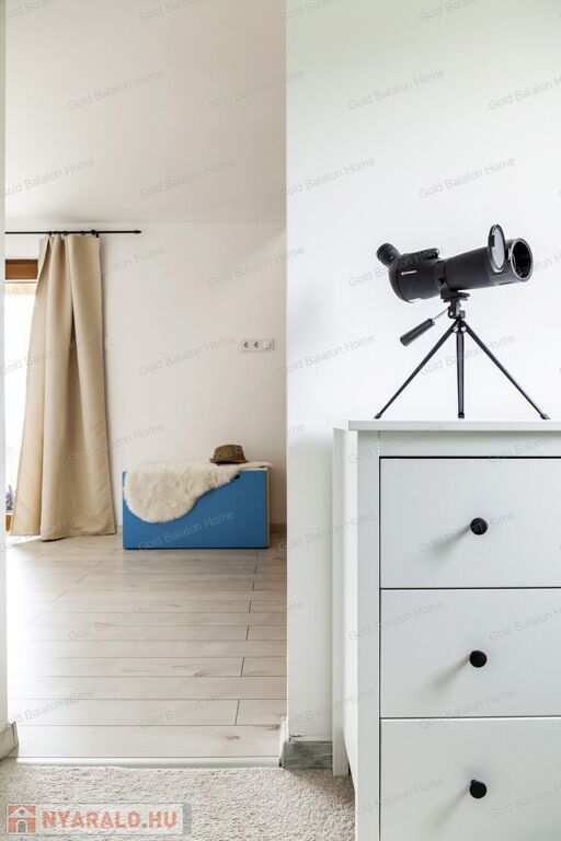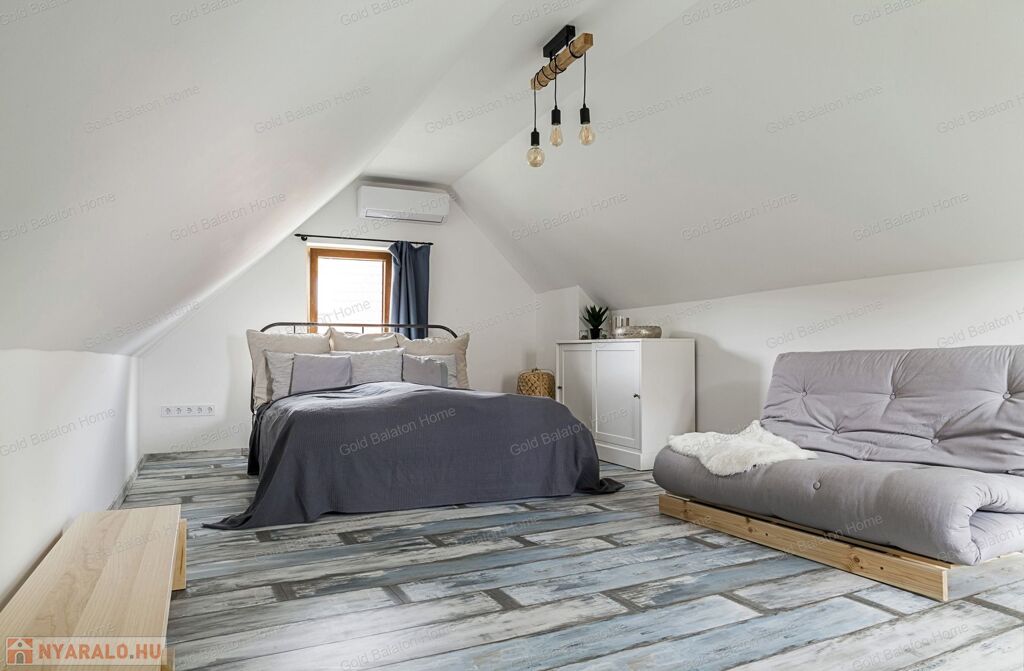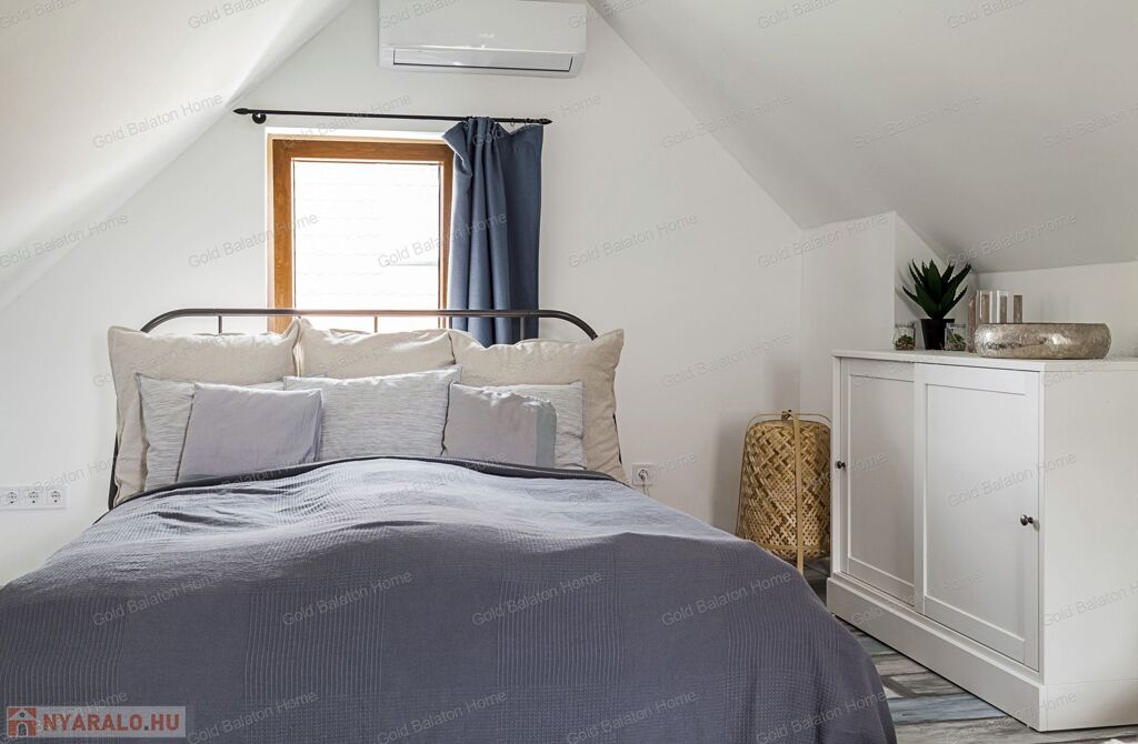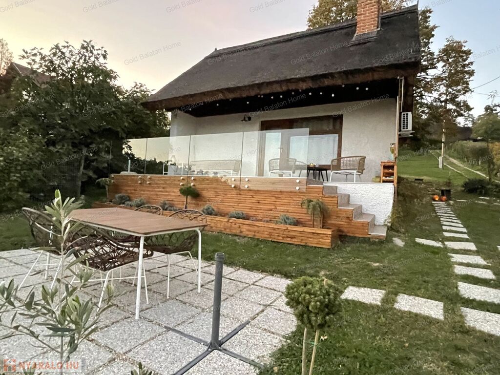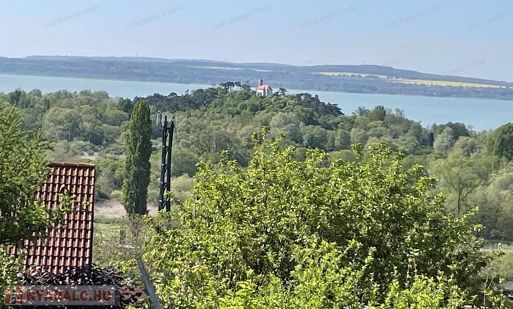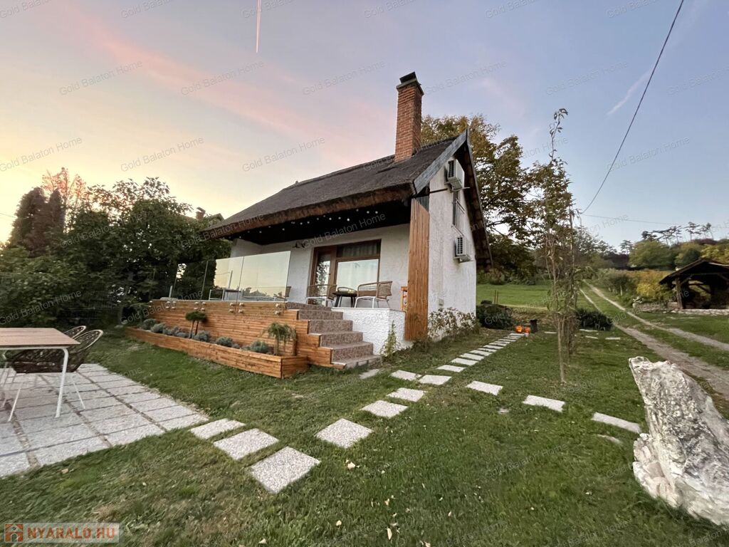 A kitűnő statikai állapotban lévő, a teljesség igényével, belsőépítész tervei által felújított, belterületi, BALATONI panorámás, tetőtér beépítéses nyaraló, csendes, zöldövezetben helyezkedik el a település északi oldalán az erdő szomszédságában. LKe1-Sz övezet (kertvárosias lakóterület, 30 %-os beépíthetőség) ezáltal a nyaraló bővíthető.