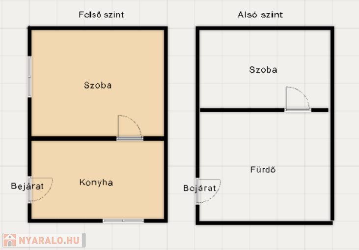 Felső szinten található a konyha és a szoba, alsó szinten a fürdőszoba és egy kis méretű helység.