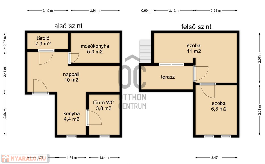 - A jó állapotú 44 m2-es ház felső szintjén két és fél szoba kapott helyet.