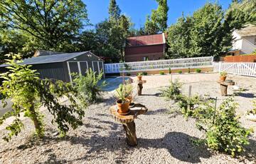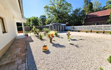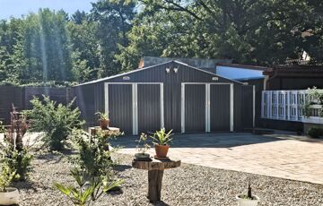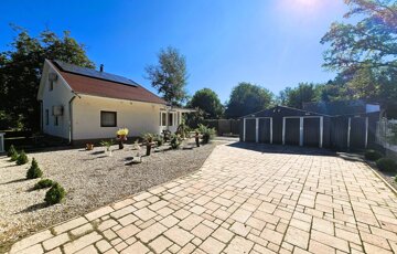 A rendezett kertben egy 30 m²-es dupla lemezgarázs, valamint egy 8 m²-es tároló is található. A garázs előtti térkövezett udvar kényelmes parkolási lehetőséget biztosít, az ingatlan biztonságáról pedig kamerarendszer gondoskodik.