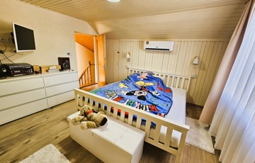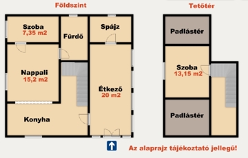 A praktikus belső elrendezésnek köszönhetően a földszinten található egy nappali, egy hálószoba, konyha, étkező, tusolós fürdőszoba és spájz. Az emeleti szobába egy különleges, elegáns tölgyfalépcső vezet, amely tovább fokozza az otthonos hangulatot, és egyediséget kölcsönöz az ingatlannak.