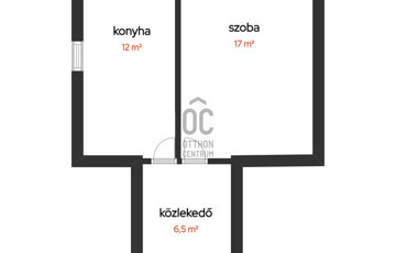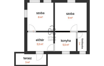 A fedett teraszon keresztül juthatunk a földszinti lakrészbe, ahol az előtérből két szoba, konyha étkezővel és fürdőszoba WC-vel található.