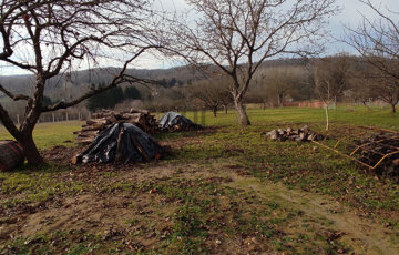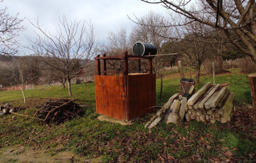 A nagyméretű esővíztartály a sok gyümölcsfával rendelkező kert locsolásában segít.